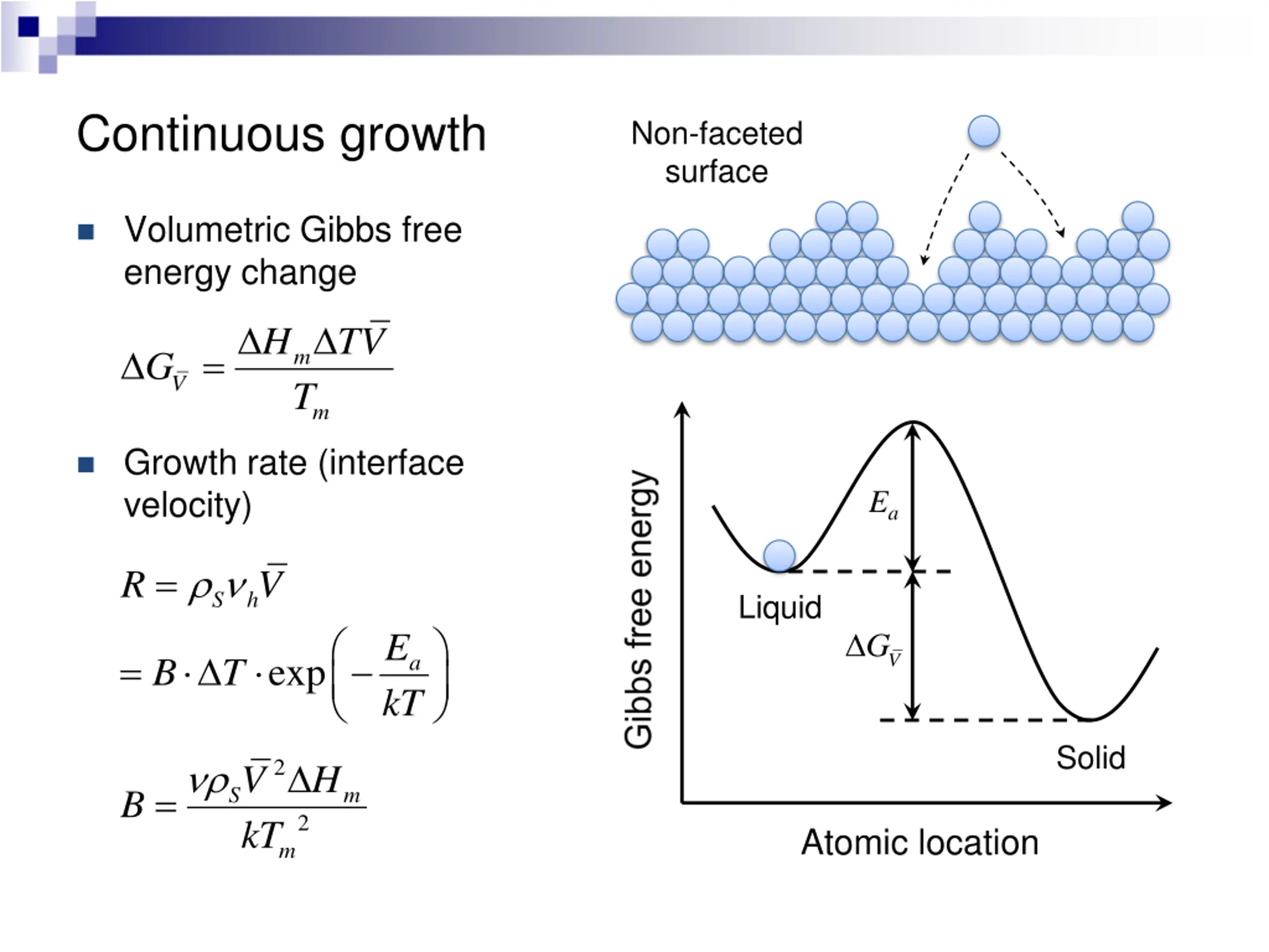 Continuous growth Non-faceted surface Volumetric Gibbs free energy change H TV = m T G V m Growth rate (interface velocity) Ea = R V S h Liquid E kT G = V exp a B T Solid 2 V kT H = S m B 2 Atomic location m