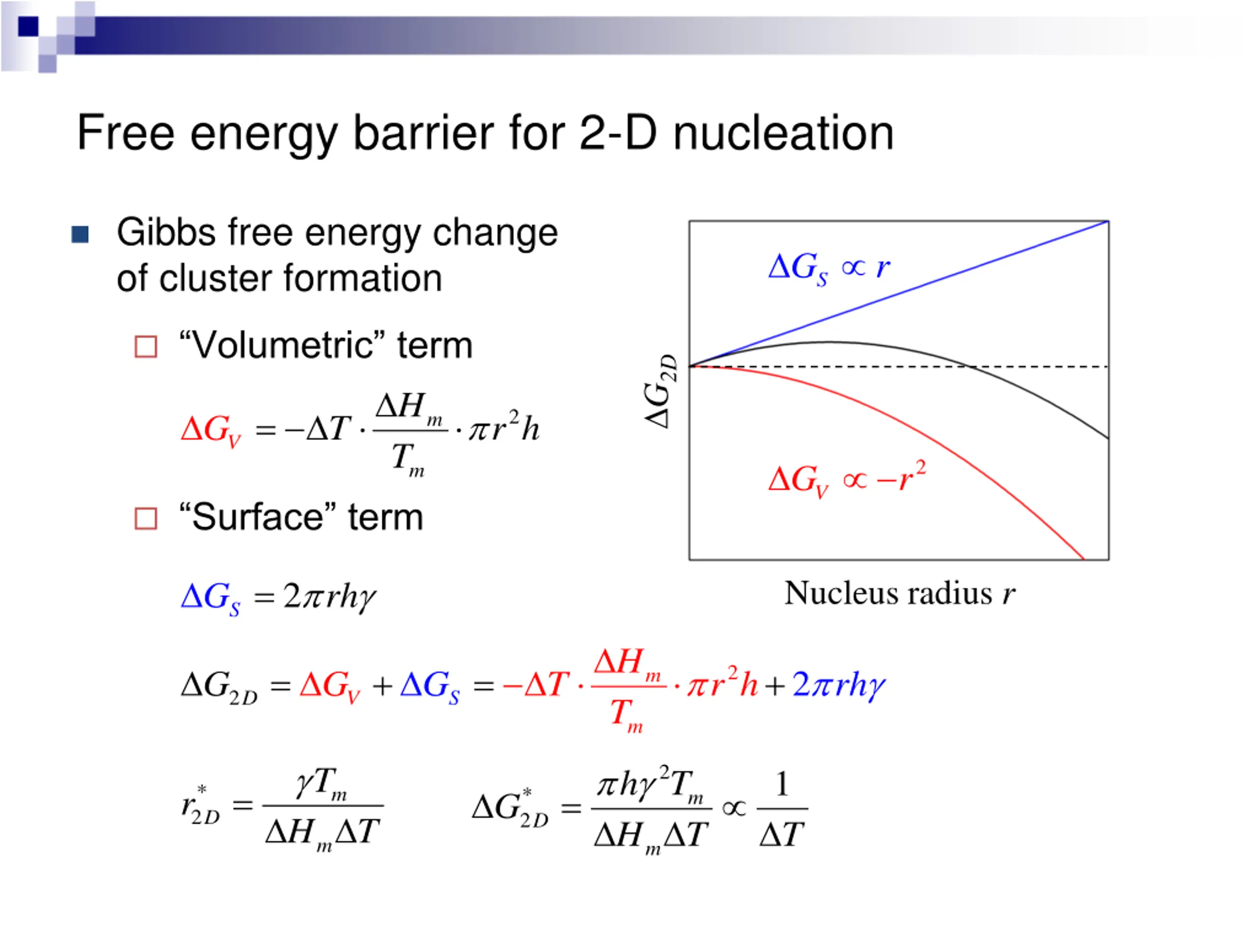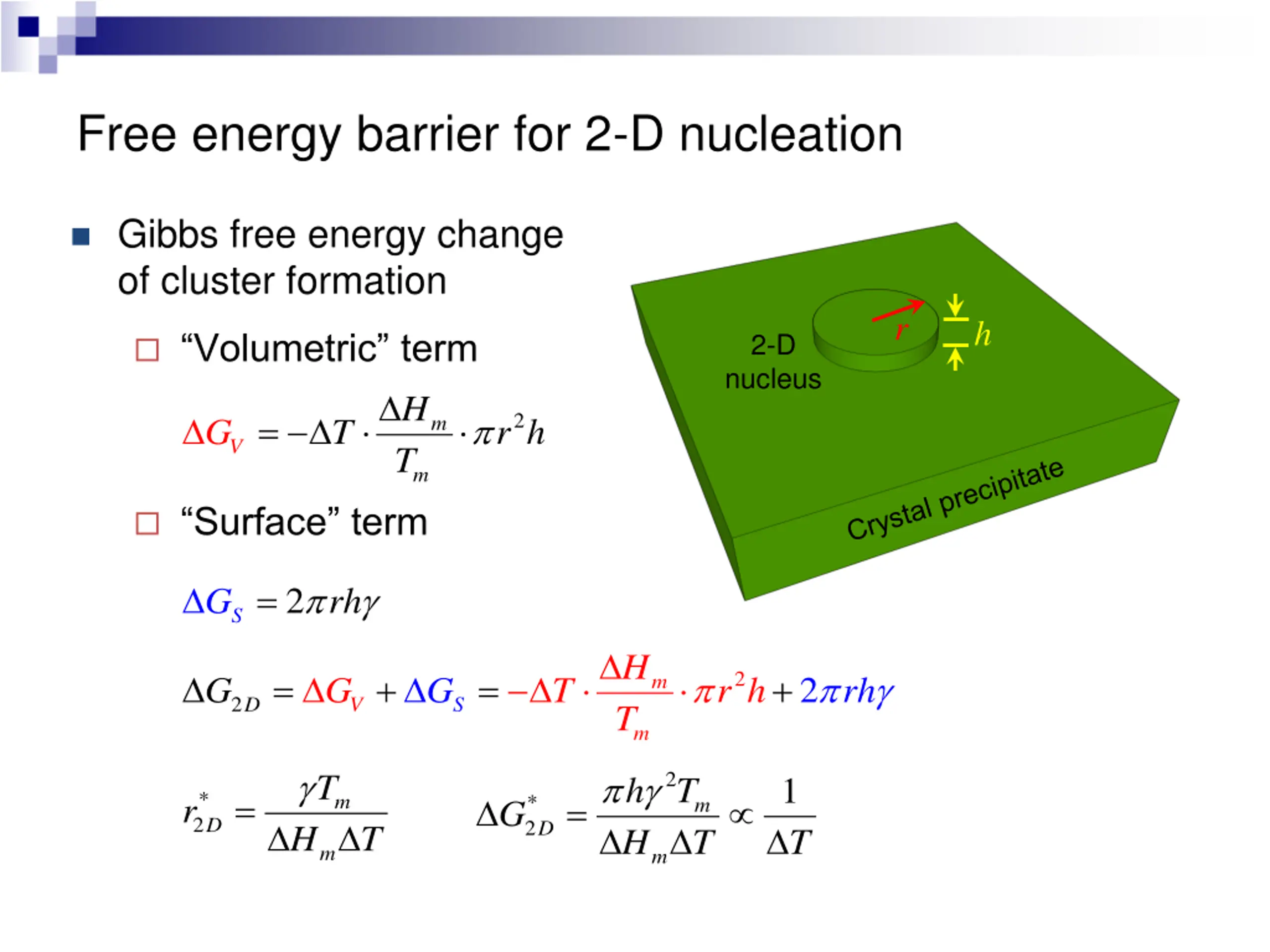 Free energy barrier for 2-D nucleation Gibbs free energy change of cluster formation G r S Volumetric term G2D H T = 2 m G T r h V 2 G r m V Surface term = 2 Nucleus radius r G rh S H T = + = + 2 2 m G G G T r h rh 2 D V S m H H T 2 1 T h T = * 2 = m r * 2 m T G D D T m m