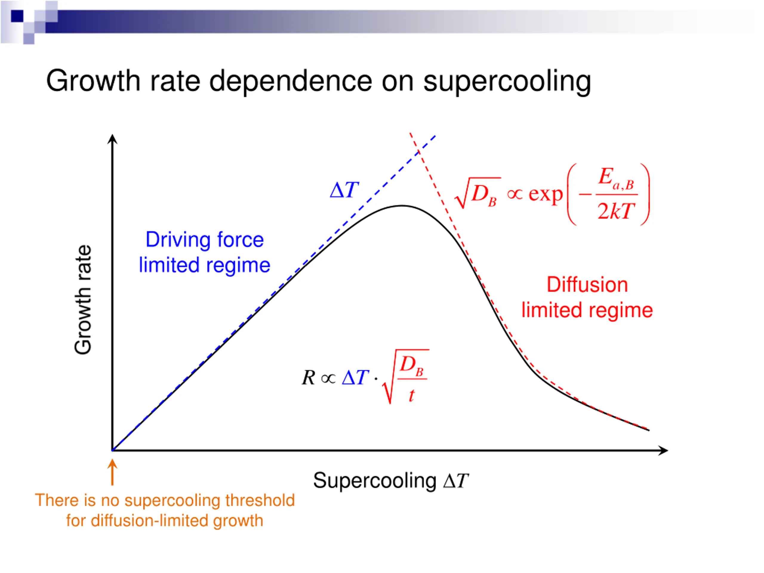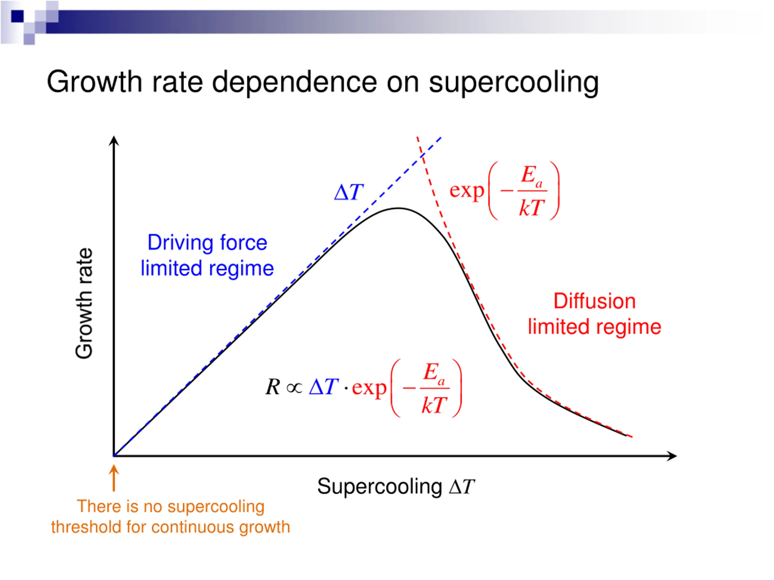 Growth rate dependence on supercooling exp E kT a T Driving force limited regime Diffusion limited regime exp E kT a R T Supercooling T There is no supercooling threshold for continuous growth