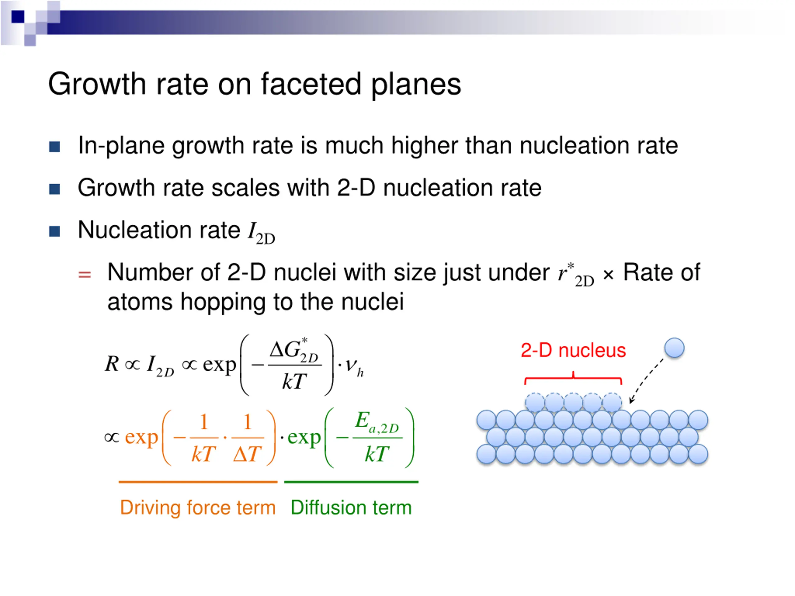 Growth rate on faceted planes In-plane growth rate is much higher than nucleation rate Growth rate scales with 2-D nucleation rate Nucleation rate I2D = Number of 2-D nuclei with size just under r*2D Rate of atoms hopping to the nuclei * G kT 2-D nucleus e p x 2 R I D 2 D h E 1 1 T ,2 a D e x p e xp kT kT Driving force term Diffusion term
