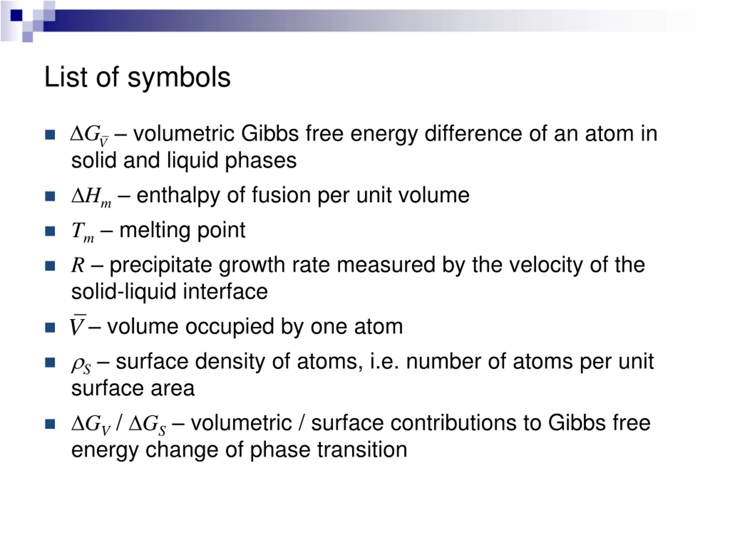 List of symbols volumetric Gibbs free energy difference of an atom in solid and liquid phases Hm enthalpy of fusion per unit volume Tm melting point R precipitate growth rate measured by the velocity of the solid-liquid interface V G V volume occupied by one atom S surface density of atoms, i.e. number of atoms per unit surface area GV / GS volumetric / surface contributions to Gibbs free energy change of phase transition