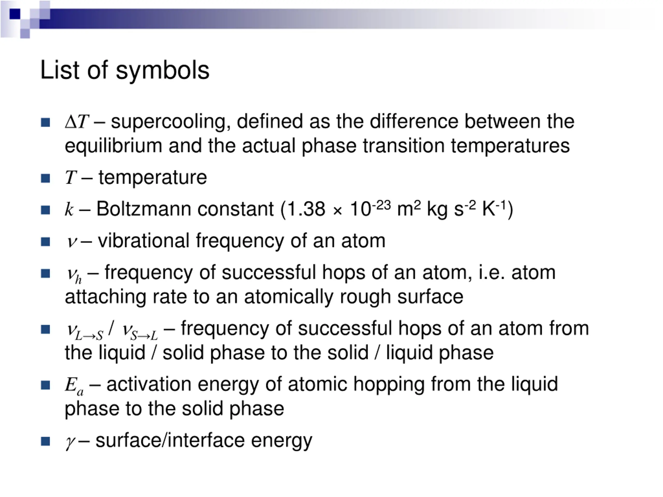 List of symbols T supercooling, defined as the difference between the equilibrium and the actual phase transition temperatures T temperature k Boltzmann constant (1.38 10-23m2kg s-2K-1) vibrational frequency of an atom h frequency of successful hops of an atom, i.e. atom attaching rate to an atomically rough surface L S / S L frequency of successful hops of an atom from the liquid / solid phase to the solid / liquid phase Ea activation energy of atomic hopping from the liquid phase to the solid phase surface/interface energy