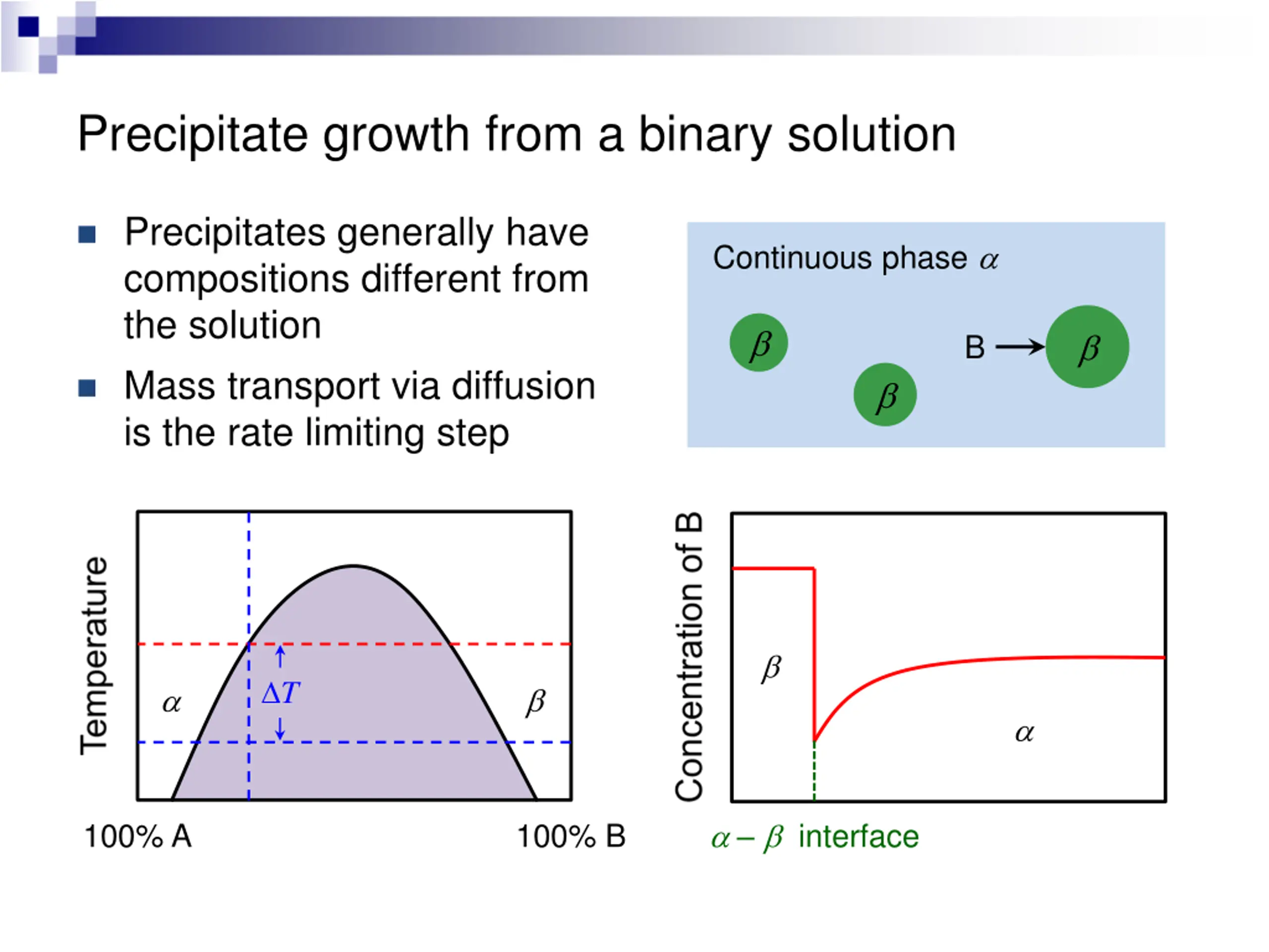 Precipitate growth from a binary solution Precipitates generally have compositions different from the solution Continuous phase B Mass transport via diffusion is the rate limiting step T interface 100% A 100% B