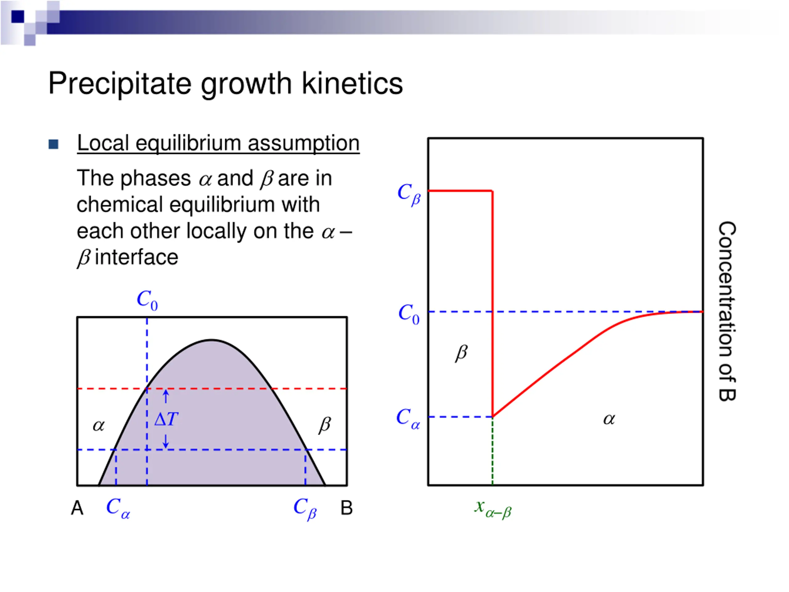 Precipitate growth kinetics Local equilibrium assumption The phases and are in chemical equilibrium with each other locally on the interface C C0 C0 C T x C C A B
