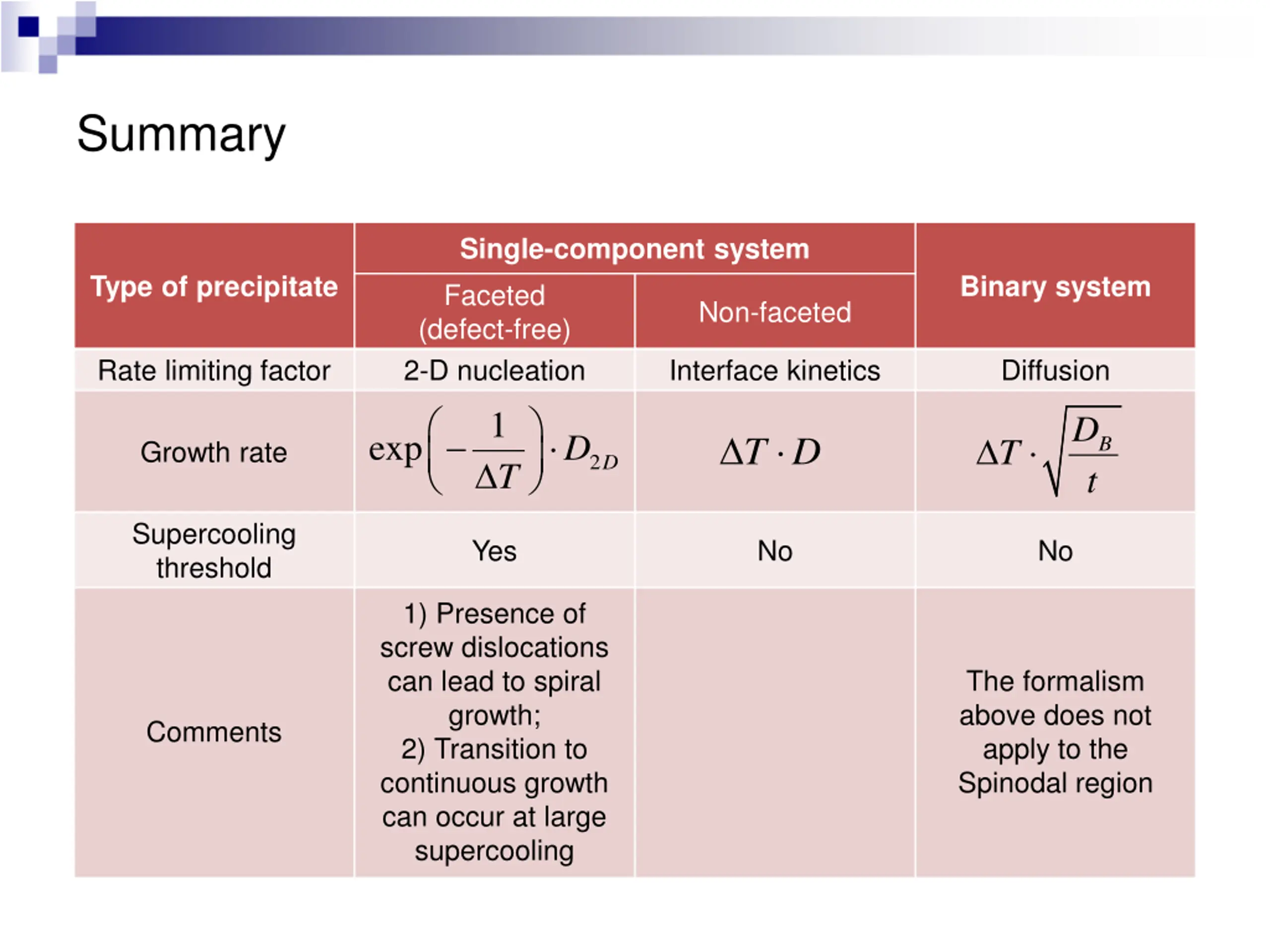 Summary Single-component system Faceted (defect-free) 2-D nucleation 1 exp T Type of precipitate Binary system Non-faceted Rate limiting factor Interface kinetics Diffusion D T D D T B Growth rate 2 D t Supercooling threshold Yes No No 1) Presence of screw dislocations can lead to spiral growth; 2) Transition to continuous growth can occur at large supercooling The formalism above does not apply to the Spinodal region Comments