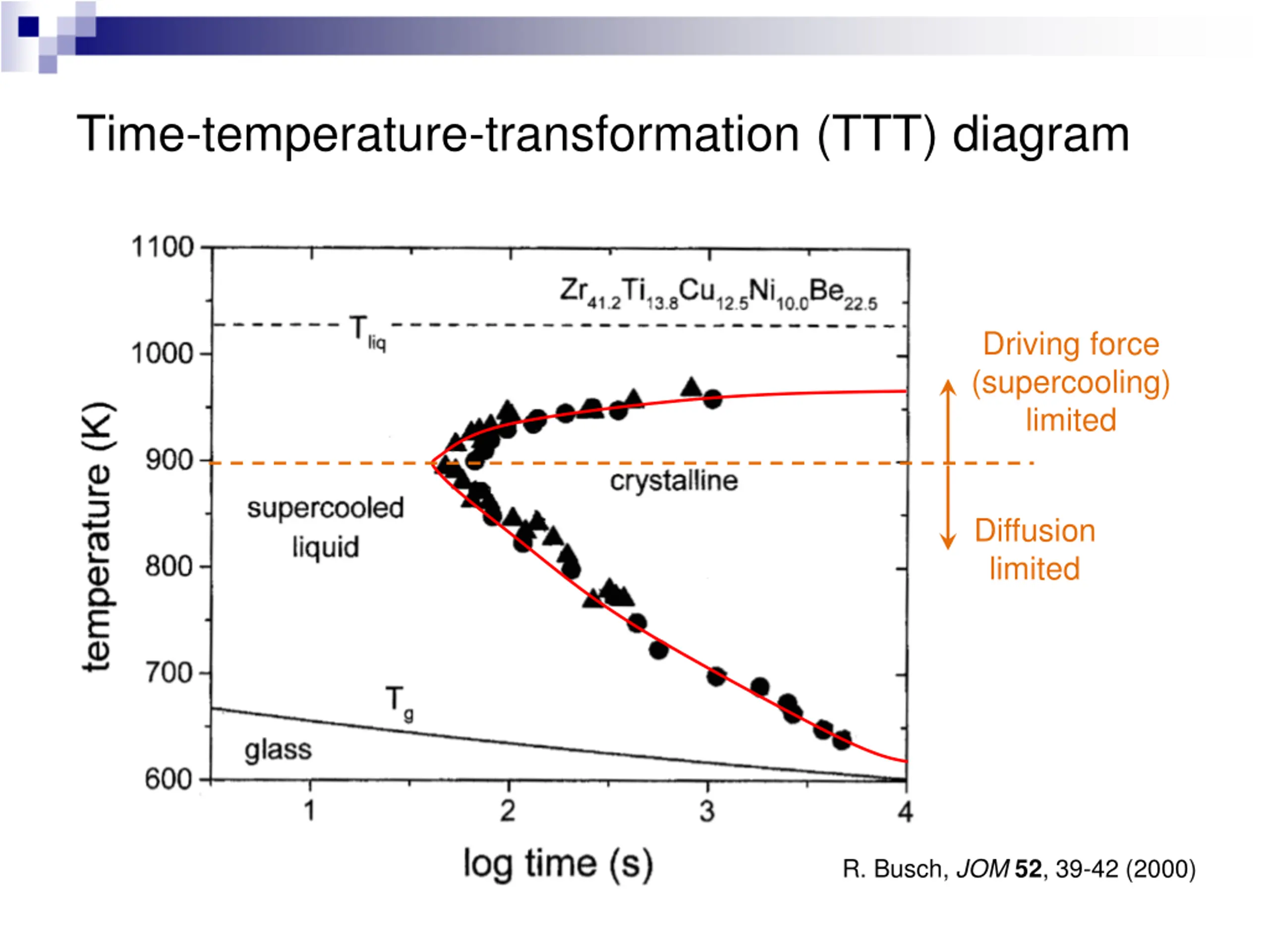 Time-temperature-transformation (TTT) diagram Driving force (supercooling) limited Diffusion limited R. Busch, JOM52, 39-42 (2000)