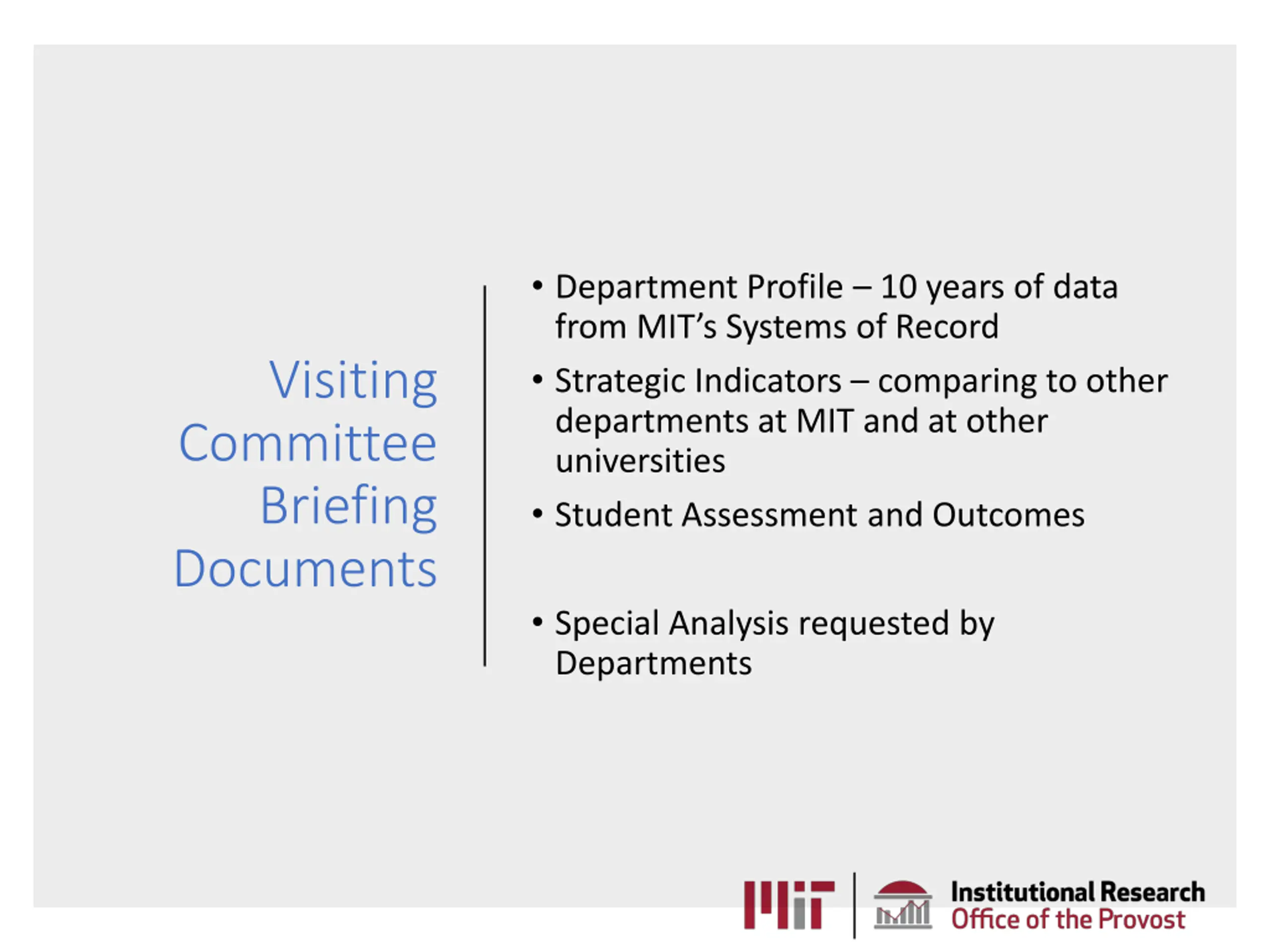 Department Profile 10 years of data from MIT s Systems of Record Strategic Indicators comparing to other departments at MIT and at other universities Student Assessment and Outcomes Visiting Committee Briefing Documents Special Analysis requested by Departments