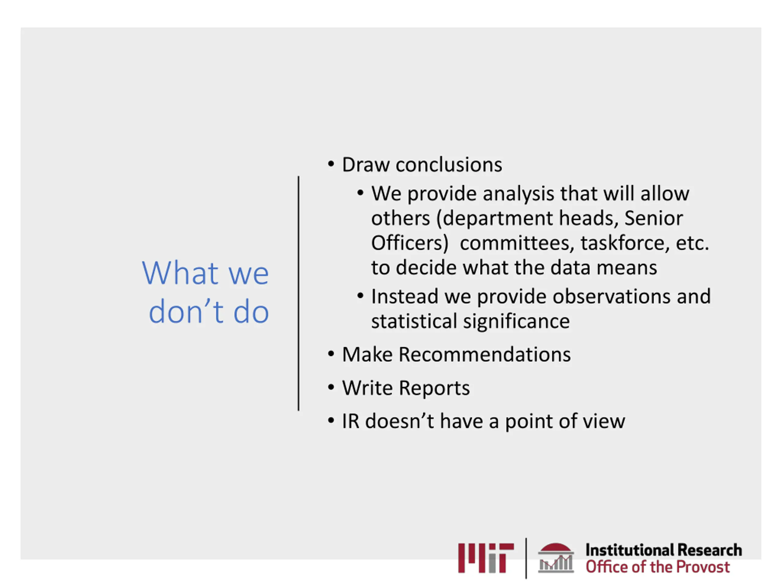 Draw conclusions We provide analysis that will allow others (department heads, Senior Officers) committees, taskforce, etc. to decide what the data means Instead we provide observations and statistical significance Make Recommendations Write Reports IR doesn t have a point of view What we don t do