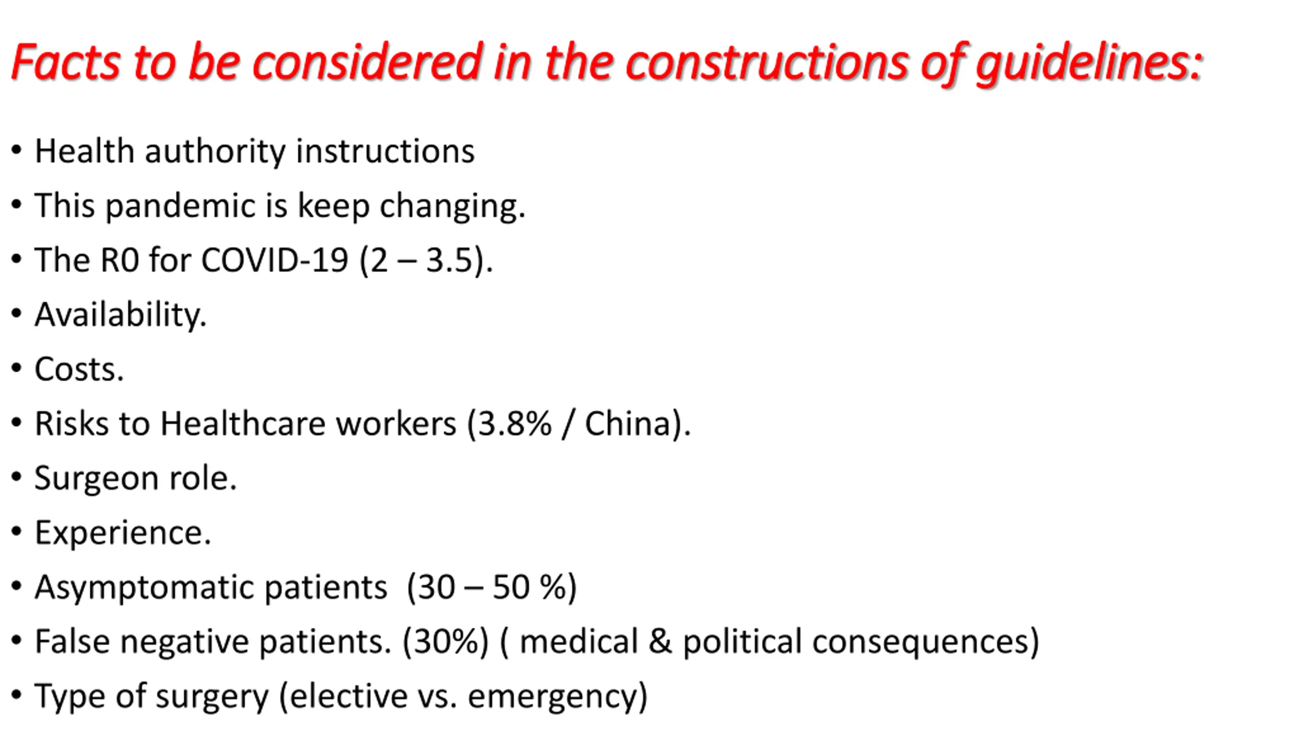 Facts to be considered in the constructions of guidelines: Facts to be considered in the constructions of guidelines: Health authority instructions This pandemic is keep changing. The R0 for COVID-19 (2 3.5). Availability. Costs. Risks to Healthcare workers (3.8% / China). Surgeon role. Experience. Asymptomatic patients (30 50 %) False negative patients. (30%) ( medical & political consequences) Type of surgery (elective vs. emergency)