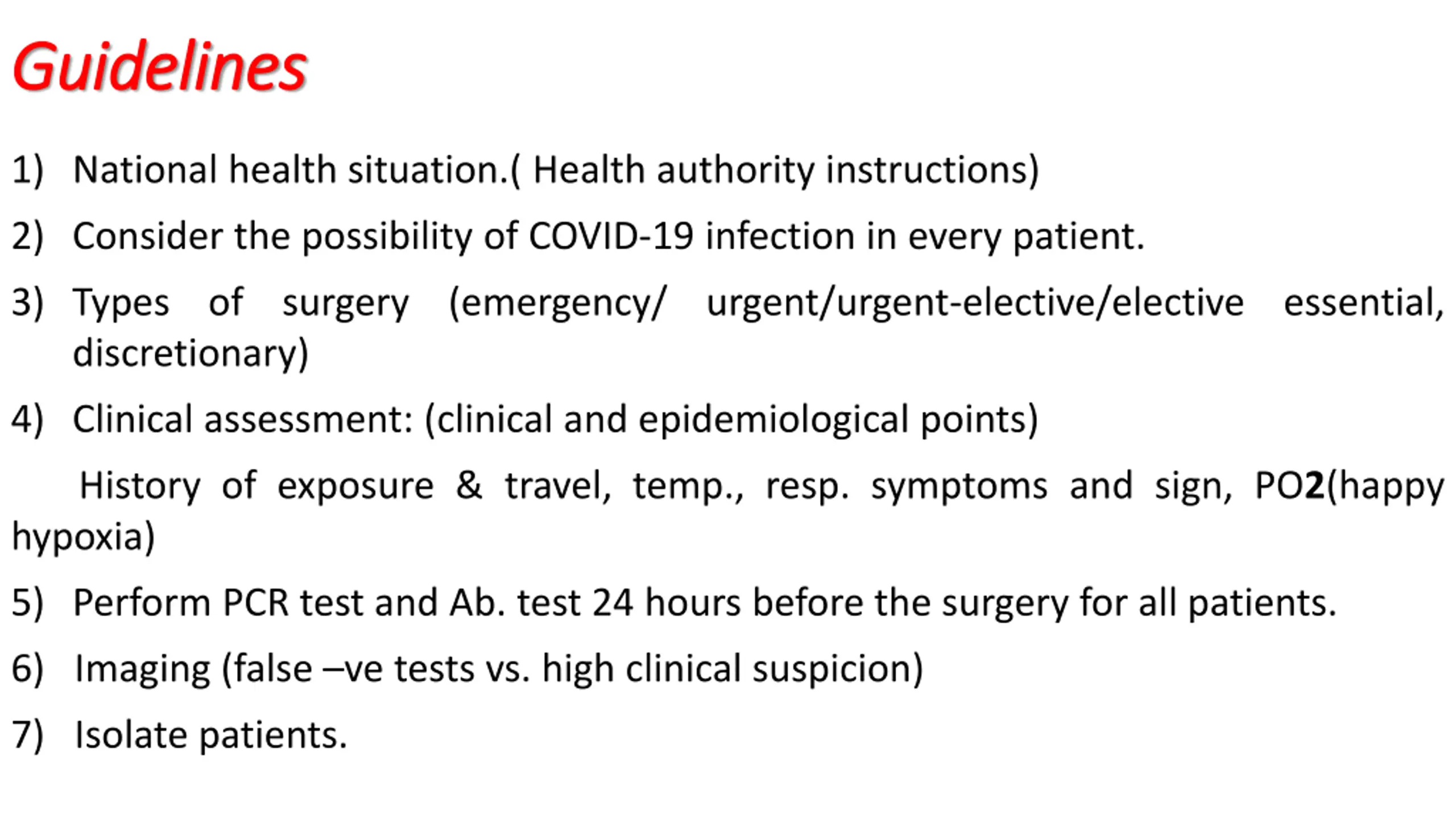 Guidelines Guidelines 1) National health situation.( Health authority instructions) 2) Consider the possibility of COVID-19 infection in every patient. 3) Types discretionary) of surgery (emergency/ urgent/urgent-elective/elective essential, 4) Clinical assessment: (clinical and epidemiological points) History of exposure & travel, temp., resp. symptoms and sign, PO2(happy hypoxia) 5) Perform PCR test and Ab. test 24 hours before the surgery for all patients. 6) Imaging (false ve tests vs. high clinical suspicion) 7) Isolate patients.
