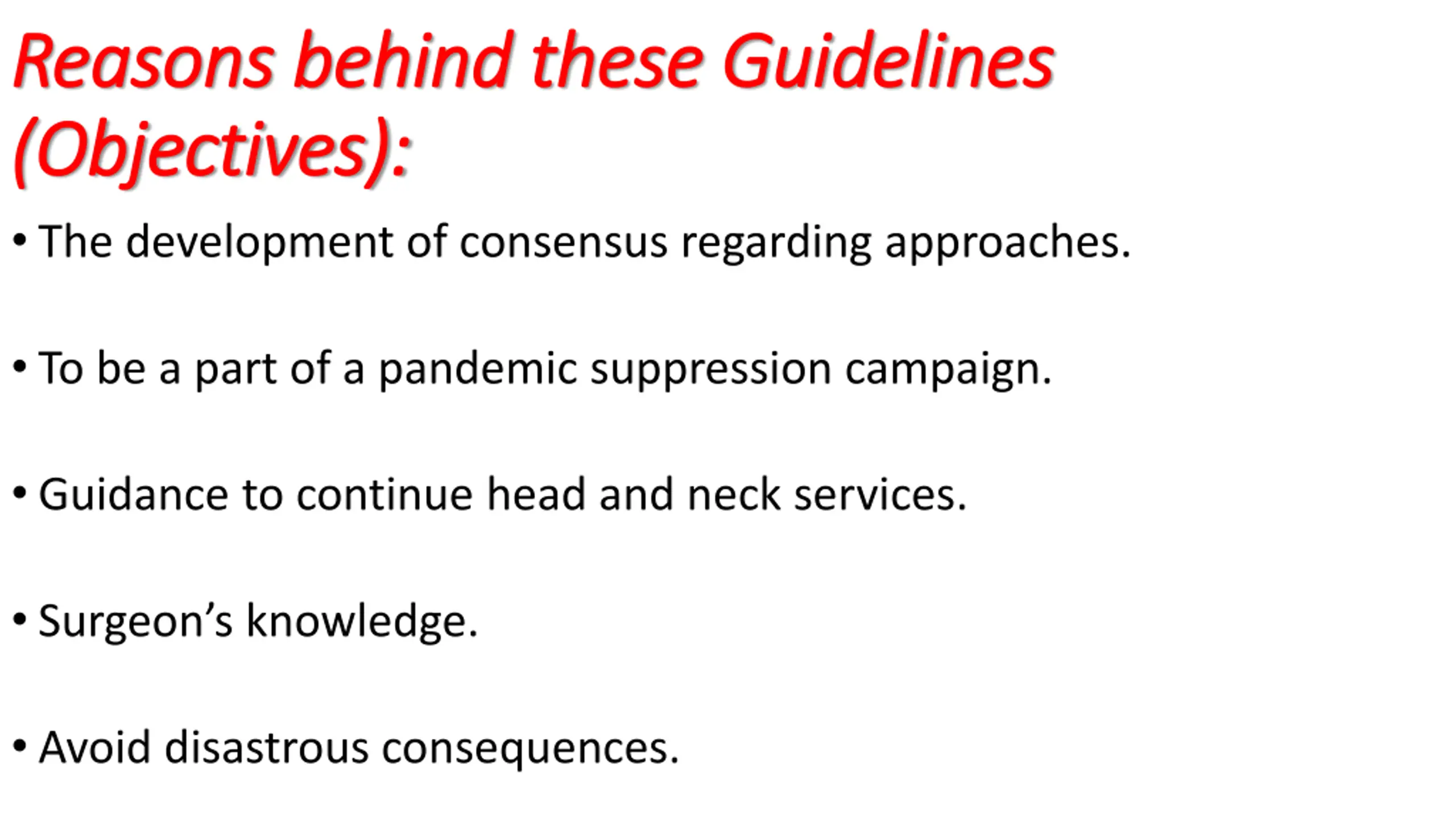 Reasons behind these Guidelines Reasons behind these Guidelines (Objectives): (Objectives): The development of consensus regarding approaches. To be a part of a pandemic suppression campaign. Guidance to continue head and neck services. Surgeon s knowledge. Avoid disastrous consequences.