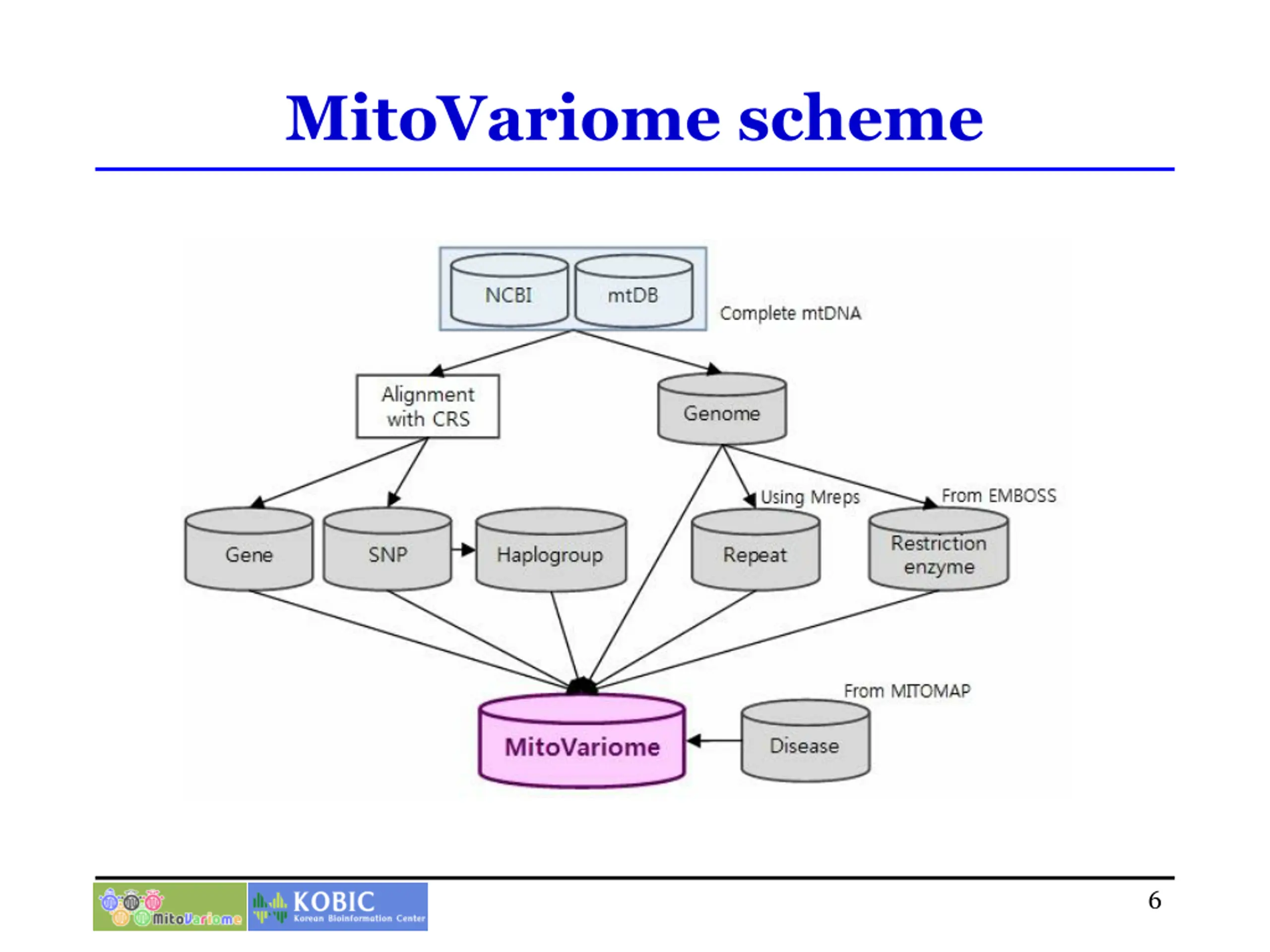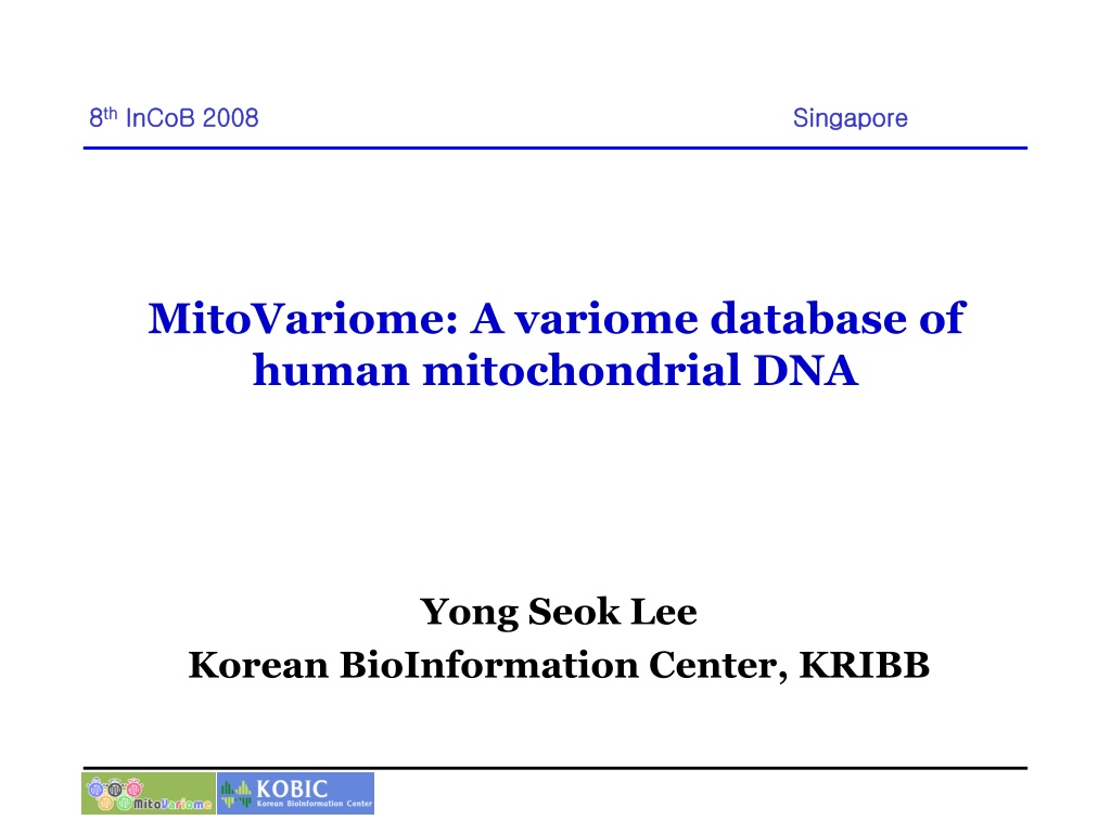 8 8th thInCoB InCoB 2008 2008 Singapore Singapore MitoVariome: A variome database of human mitochondrial DNA Yong Seok Lee Korean BioInformation Center, KRIBB