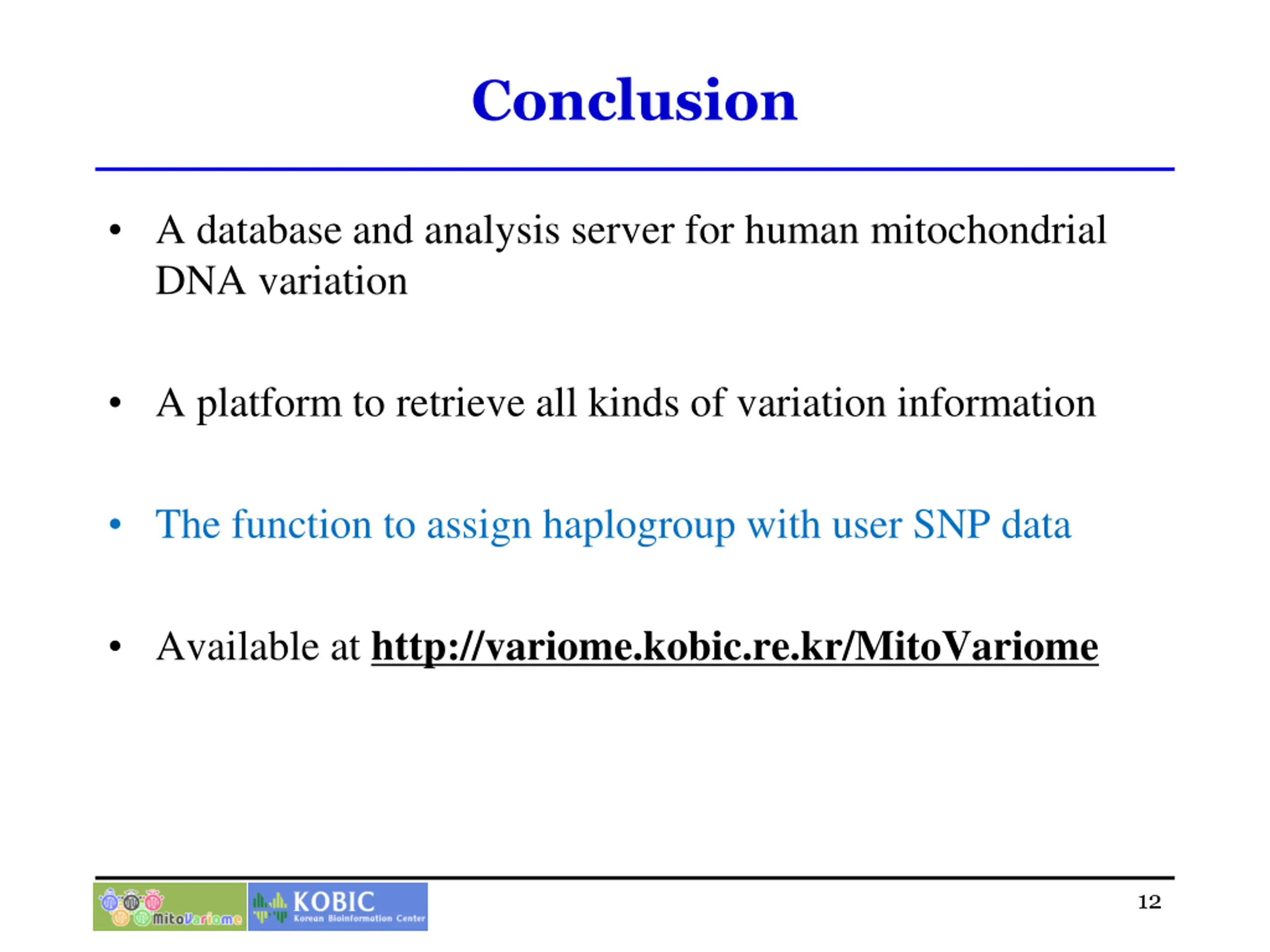 Conclusion A database and analysis server for human mitochondrial DNA variation A platform to retrieve all kinds of variation information The function to assign haplogroup with user SNP data Available at http://variome.kobic.re.kr/MitoVariome 12