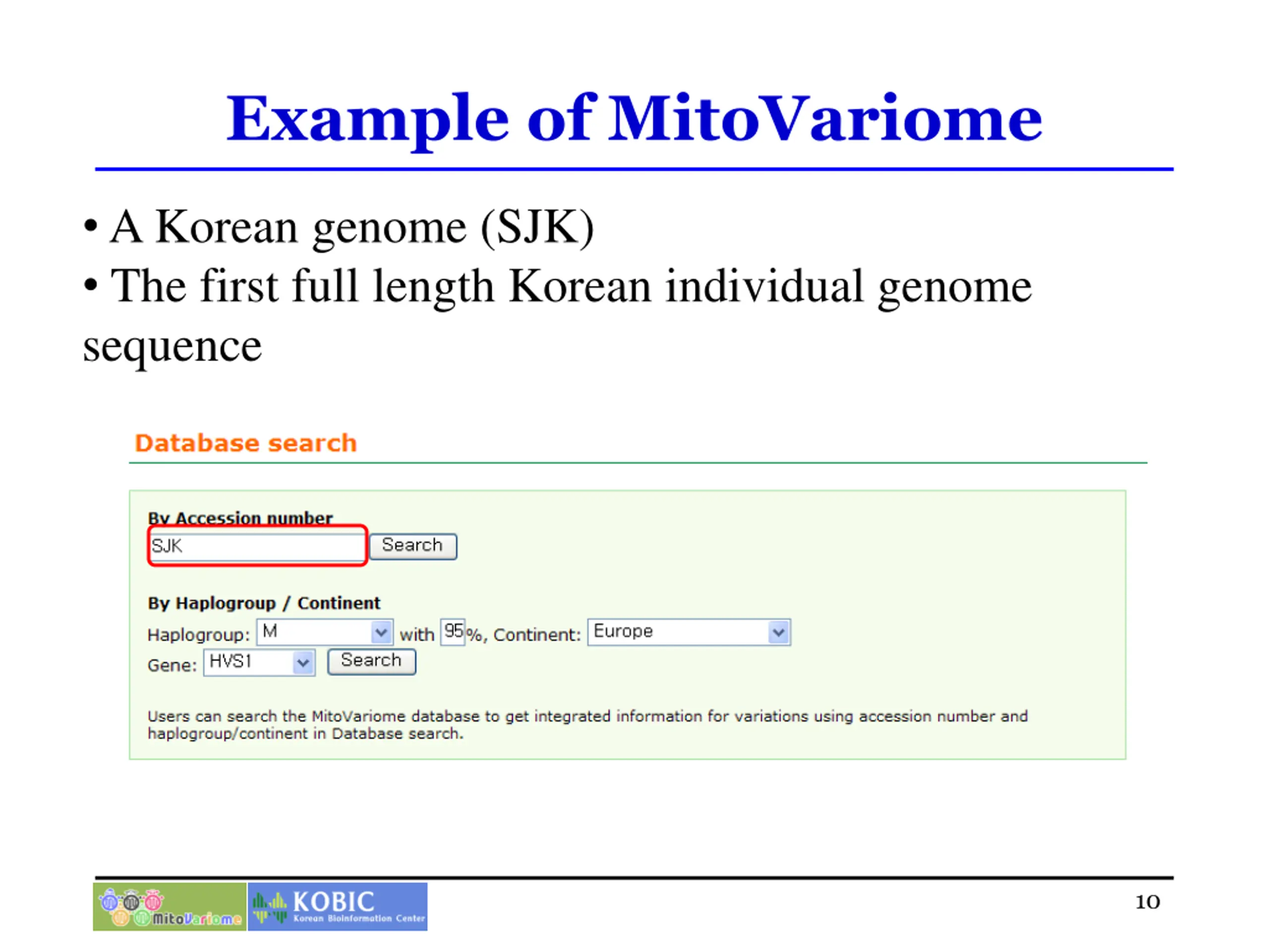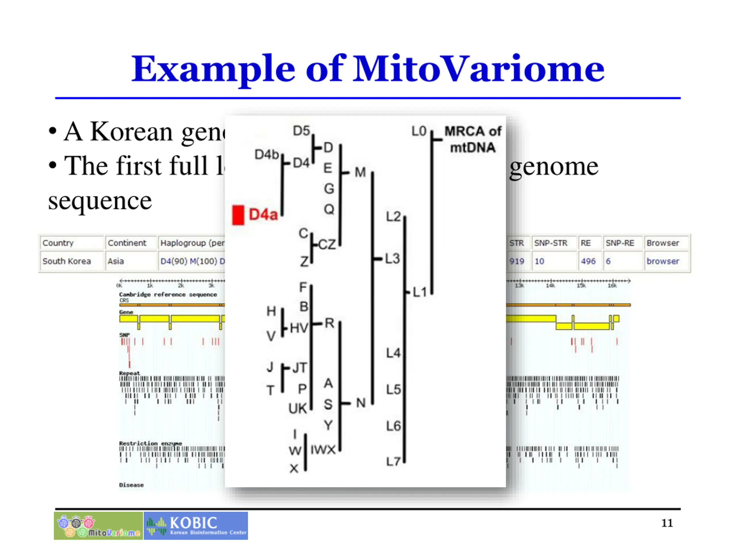 Example of MitoVariome A Korean genome (SJK) The first full length Korean individual genome sequence 10