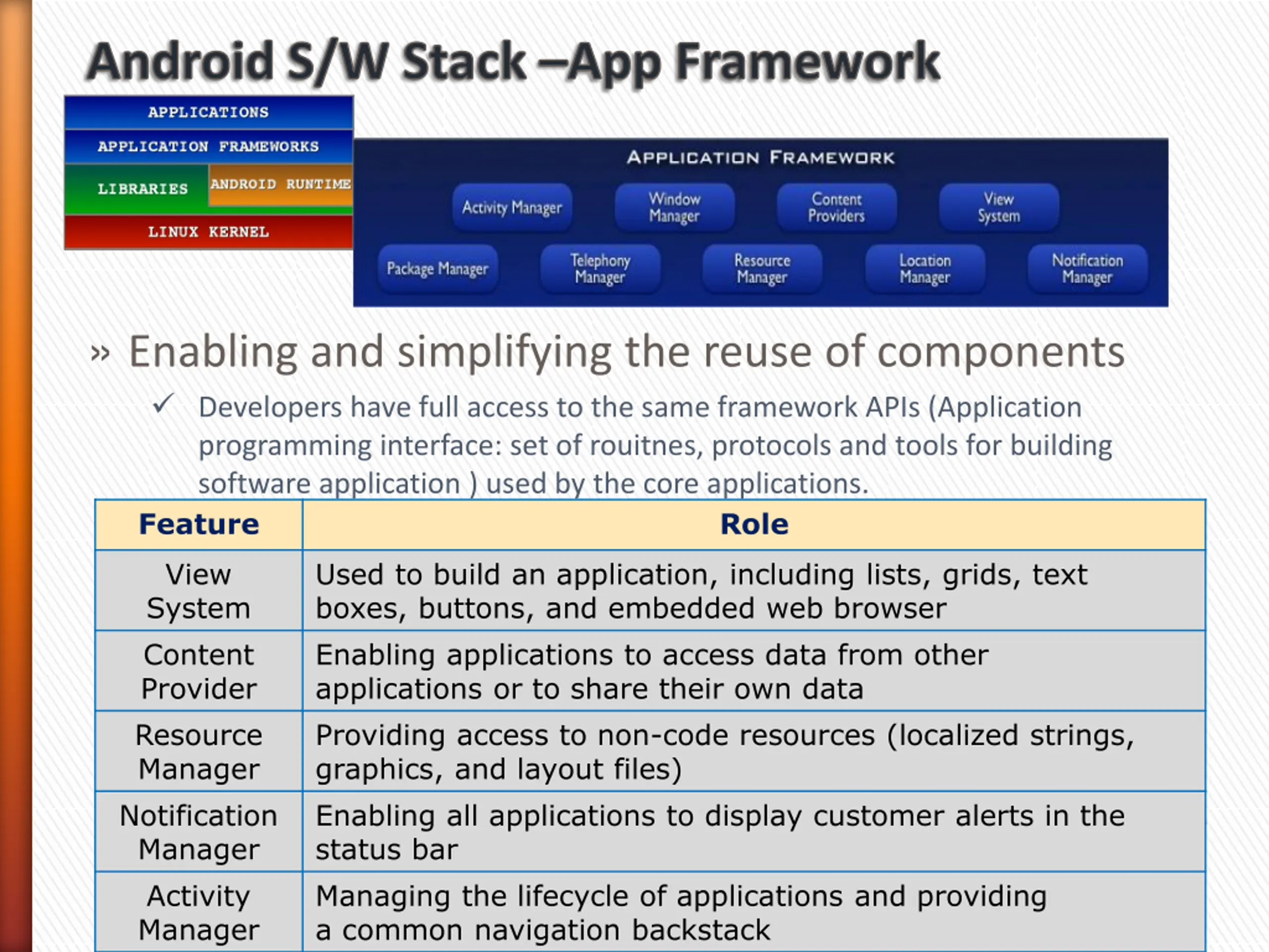 Android S/W Stack App Framework Enabling and simplifying the reuse of components Developers have full access to the same framework APIs (Application programming interface: set of rouitnes, protocols and tools for building software application ) used by the core applications. Users are allowed to replace components. Feature View System boxes, buttons, and embedded web browser Content Provider applications or to share their own data Resource Manager graphics, and layout files) Notification Manager status bar Activity Manager a common navigation backstack Role Used to build an application, including lists, grids, text Enabling applications to access data from other Providing access to non-code resources (localized strings, Enabling all applications to display customer alerts in the Managing the lifecycle of applications and providing