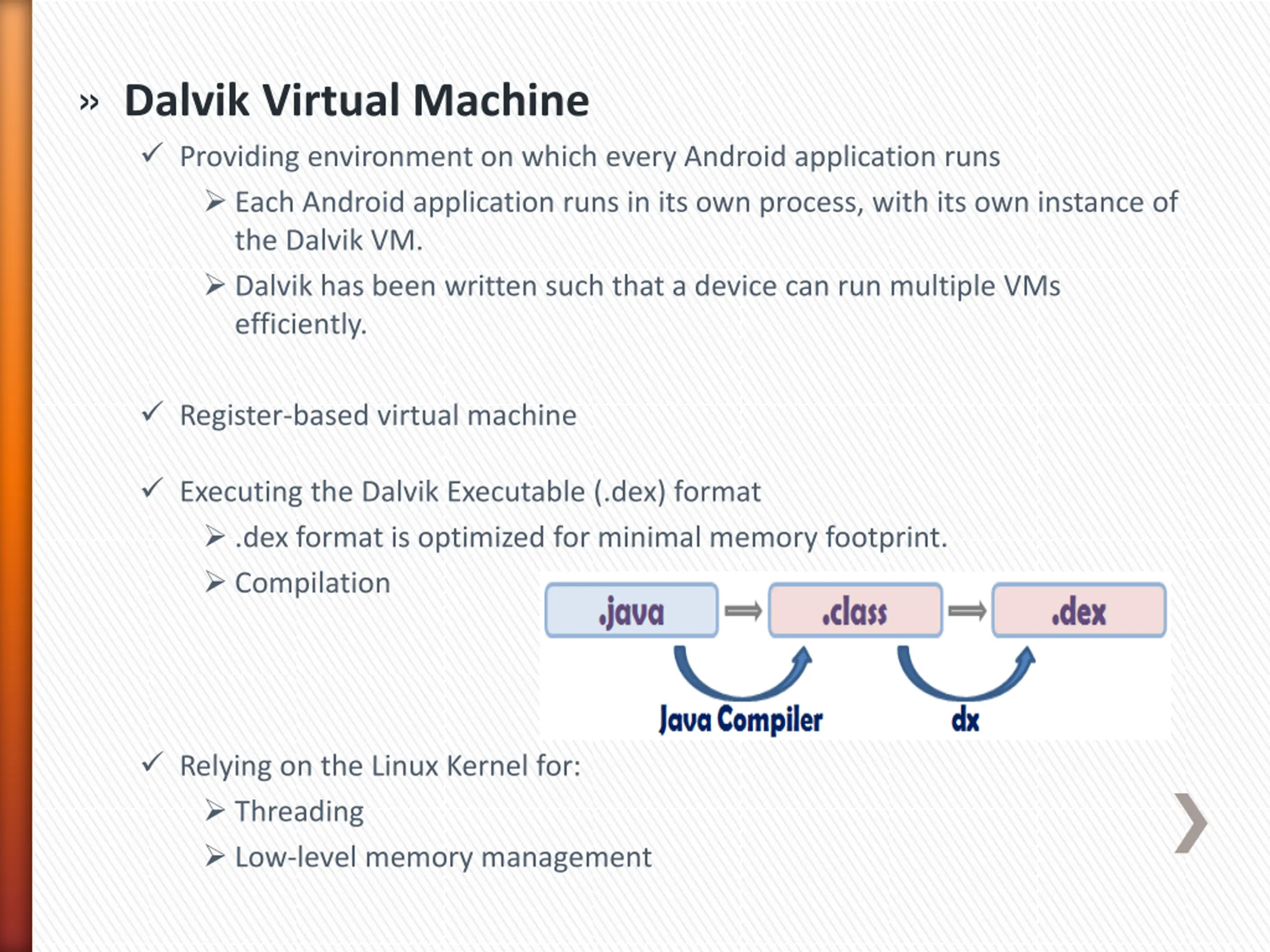 Dalvik Virtual Machine Providing environment on which every Android application runs Each Android application runs in its own process, with its own instance of the Dalvik VM. Dalvik has been written such that a device can run multiple VMs efficiently. Register-based virtual machine Executing the Dalvik Executable (.dex) format .dex format is optimized for minimal memory footprint. Compilation Relying on the Linux Kernel for: Threading Low-level memory management