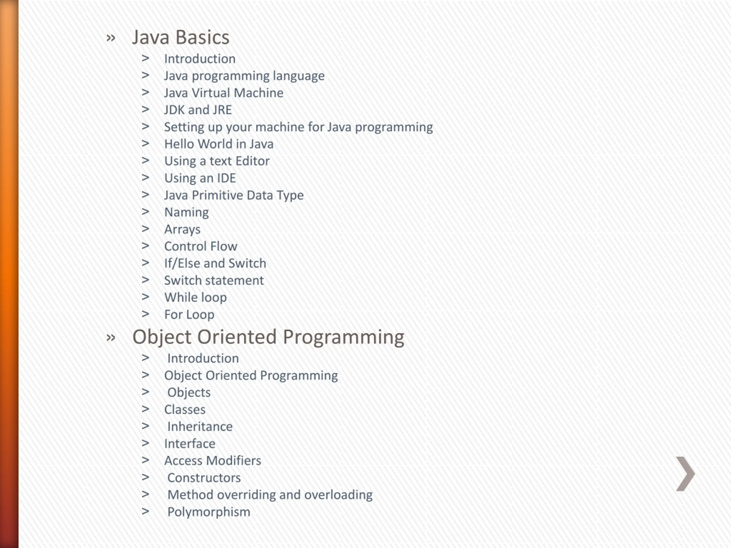 Java Basics Introduction Java programming language Java Virtual Machine JDK and JRE Setting up your machine for Java programming Hello World in Java Using a text Editor Using an IDE Java Primitive Data Type Naming Arrays Control Flow If/Else and Switch Switch statement While loop For Loop Object Oriented Programming Introduction Object Oriented Programming Objects Classes Inheritance Interface Access Modifiers Constructors Method overriding and overloading Polymorphism