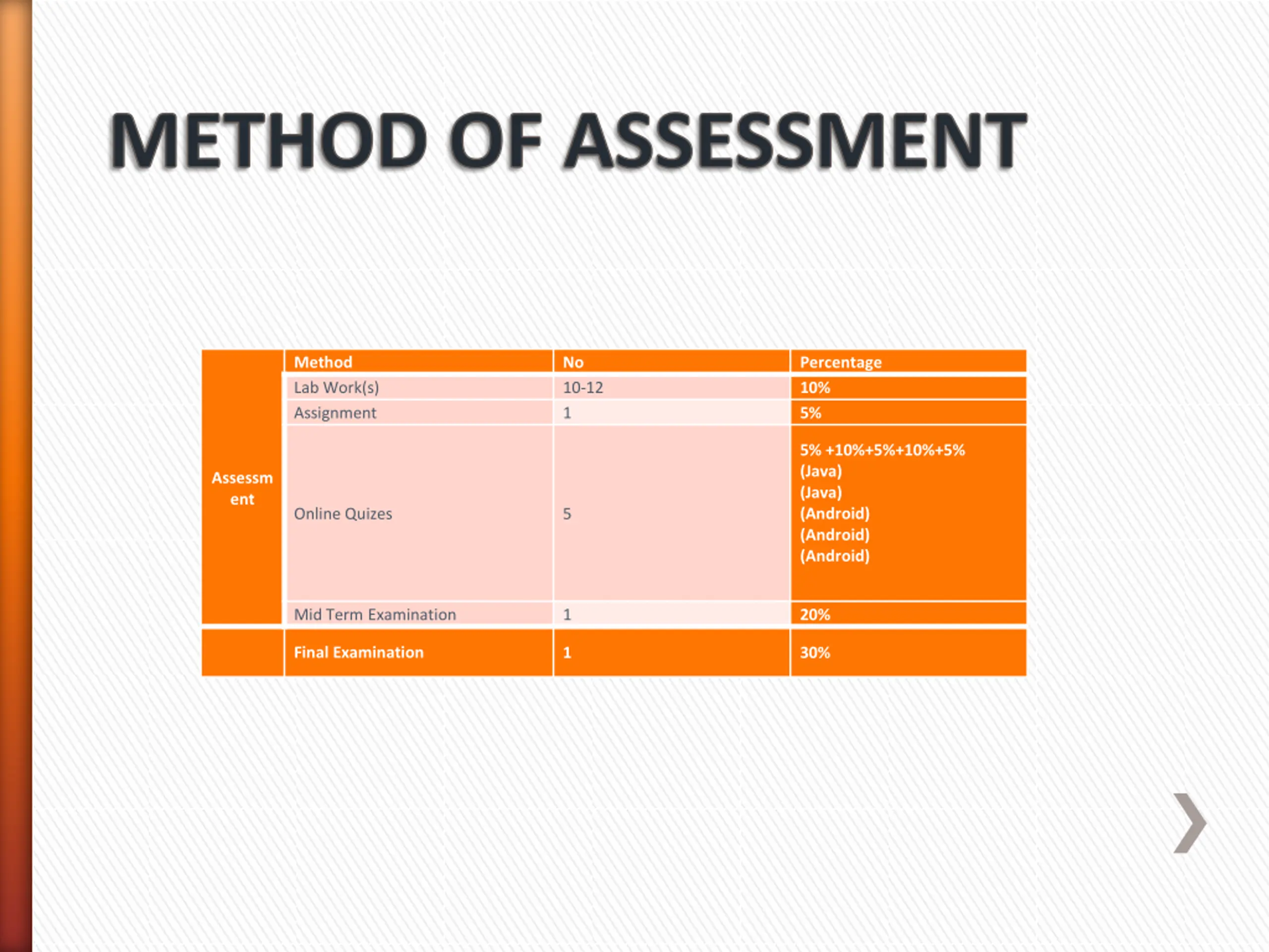 METHOD OF ASSESSMENT Method Lab Work(s) Assignment No 10-12 1 Percentage 10% 5% 5% +10%+5%+10%+5% (Java) (Java) (Android) (Android) (Android) Assessm ent Online Quizes 5 Mid Term Examination 1 20% Final Examination 1 30%