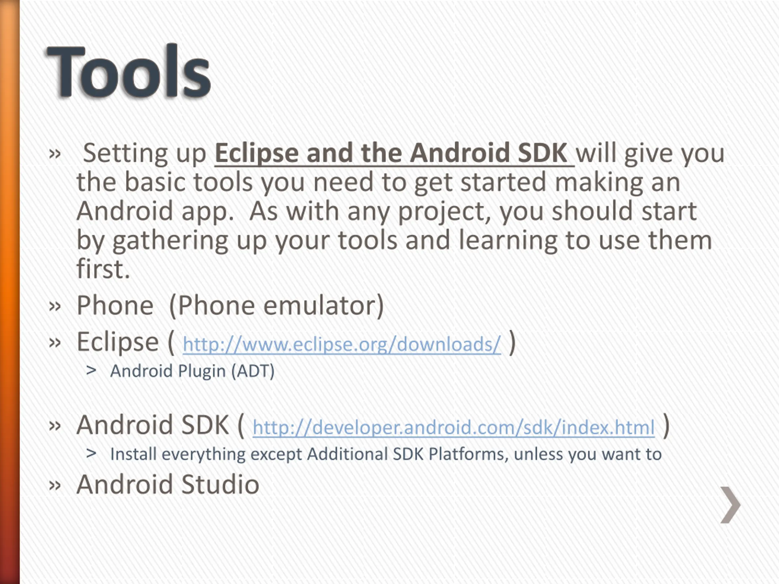 Tools Setting up Eclipse and the Android SDK will give you the basic tools you need to get started making an Android app. As with any project, you should start by gathering up your tools and learning to use them first. Phone (Phone emulator) Eclipse ( http://www.eclipse.org/downloads/ ) Android Plugin (ADT) Android SDK ( http://developer.android.com/sdk/index.html ) Install everything except Additional SDK Platforms, unless you want to Android Studio