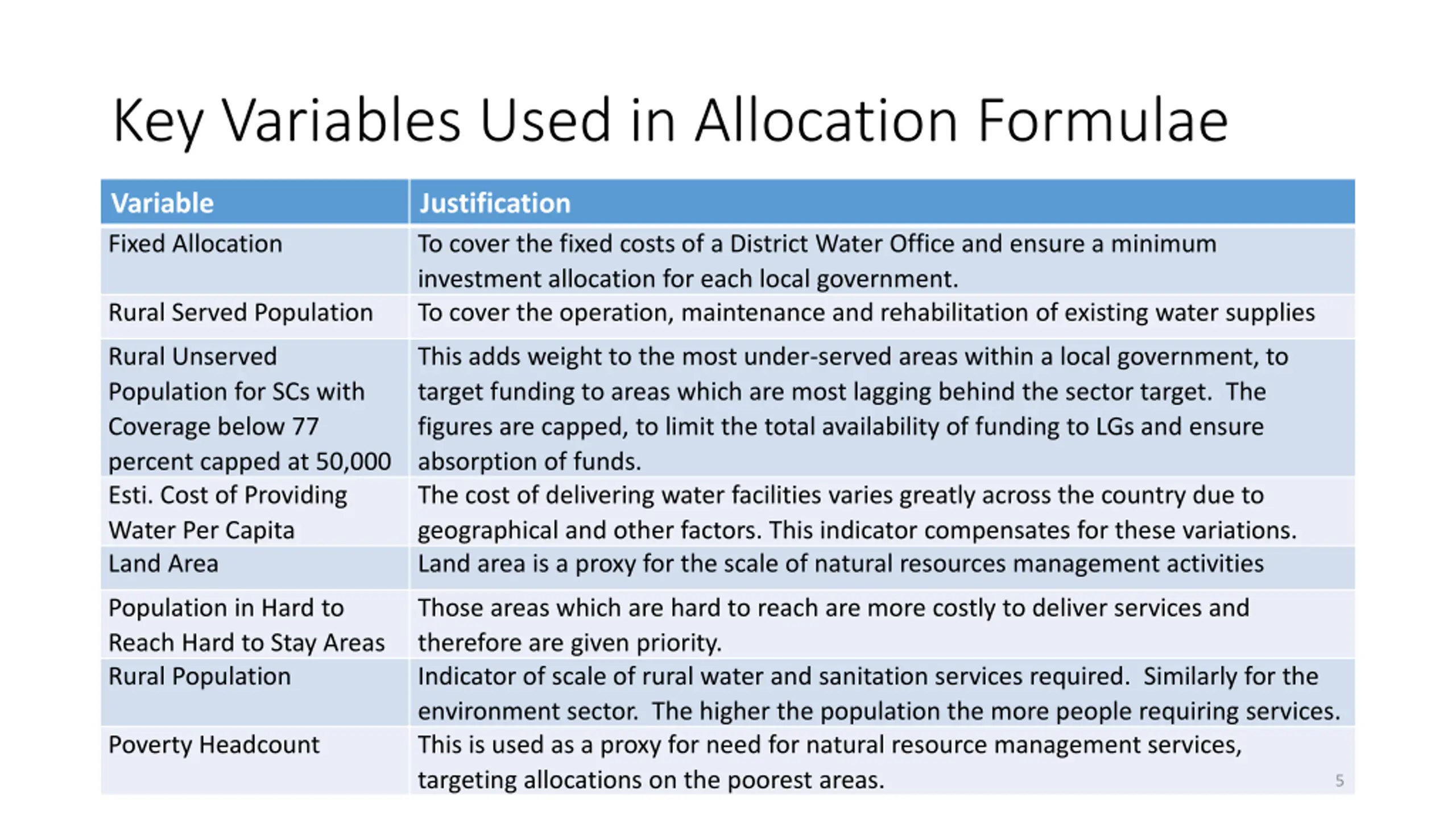 Key Variables Used in Allocation Formulae Variable Fixed Allocation Justification To cover the fixed costs of a District Water Office and ensure a minimum investment allocation for each local government. To cover the operation, maintenance and rehabilitation of existing water supplies Rural Served Population Rural Unserved Population for SCs with Coverage below 77 percent capped at 50,000 Esti. Cost of Providing Water Per Capita Land Area This adds weight to the most under-served areas within a local government, to target funding to areas which are most lagging behind the sector target. The figures are capped, to limit the total availability of funding to LGs and ensure absorption of funds. The cost of delivering water facilities varies greatly across the country due to geographical and other factors. This indicator compensates for these variations. Land area is a proxy for the scale of natural resources management activities Population in Hard to Reach Hard to Stay Areas Rural Population Those areas which are hard to reach are more costly to deliver services and therefore are given priority. Indicator of scale of rural water and sanitation services required. Similarly for the environment sector. The higher the population the more people requiring services. This is used as a proxy for need for natural resource management services, targeting allocations on the poorest areas. Poverty Headcount 5