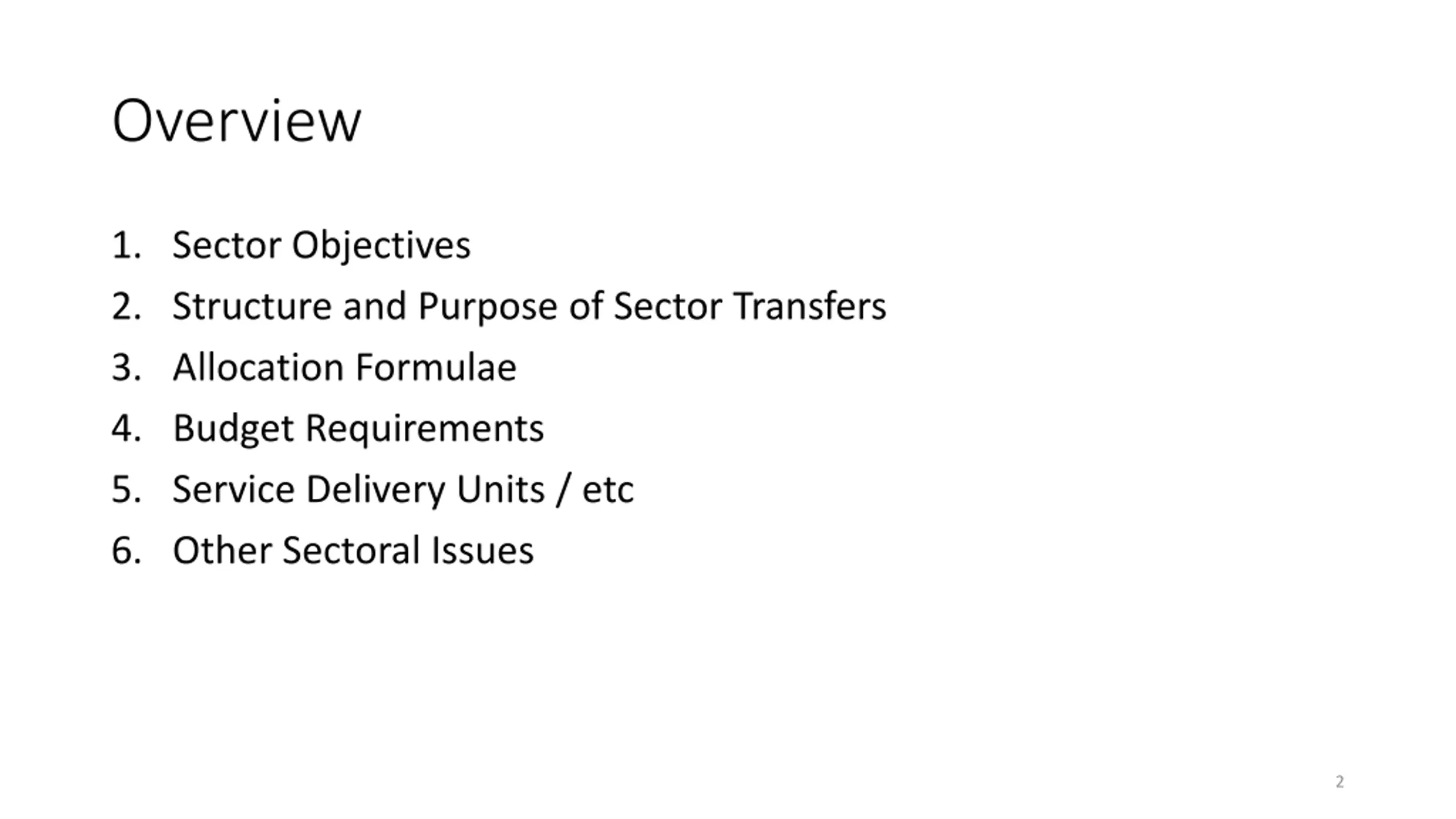 Overview 1. Sector Objectives 2. Structure and Purpose of Sector Transfers 3. Allocation Formulae 4. Budget Requirements 5. Service Delivery Units / etc 6. Other Sectoral Issues 2