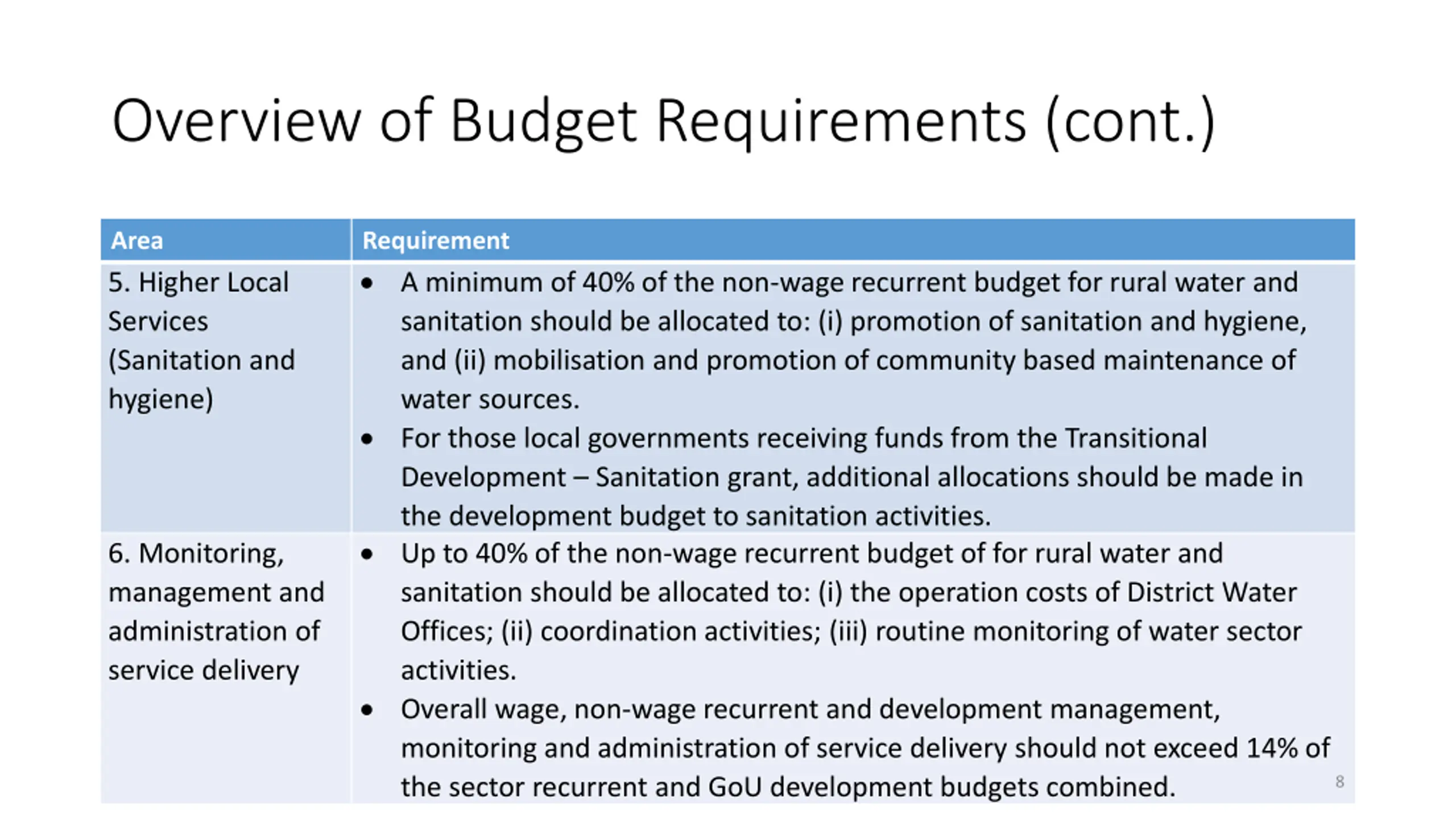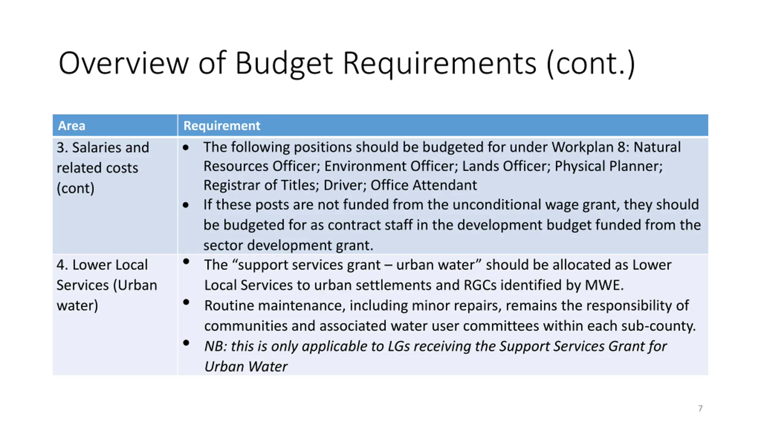 Overview of Budget Requirements (cont.) Area 3. Salaries and related costs (cont) Requirement The following positions should be budgeted for under Workplan 8: Natural Resources Officer; Environment Officer; Lands Officer; Physical Planner; Registrar of Titles; Driver; Office Attendant If these posts are not funded from the unconditional wage grant, they should be budgeted for as contract staff in the development budget funded from the sector development grant. The support services grant urban water should be allocated as Lower Local Services to urban settlements and RGCs identified by MWE. Routine maintenance, including minor repairs, remains the responsibility of communities and associated water user committees within each sub-county. NB: this is only applicable to LGs receiving the Support Services Grant for Urban Water 4. Lower Local Services (Urban water) 7