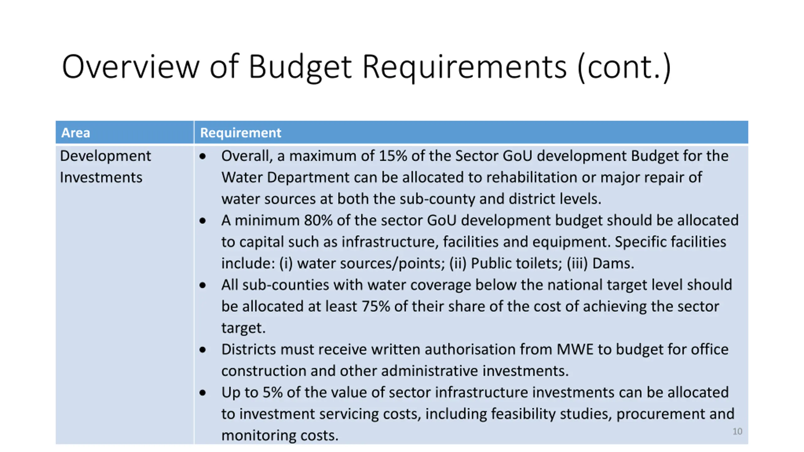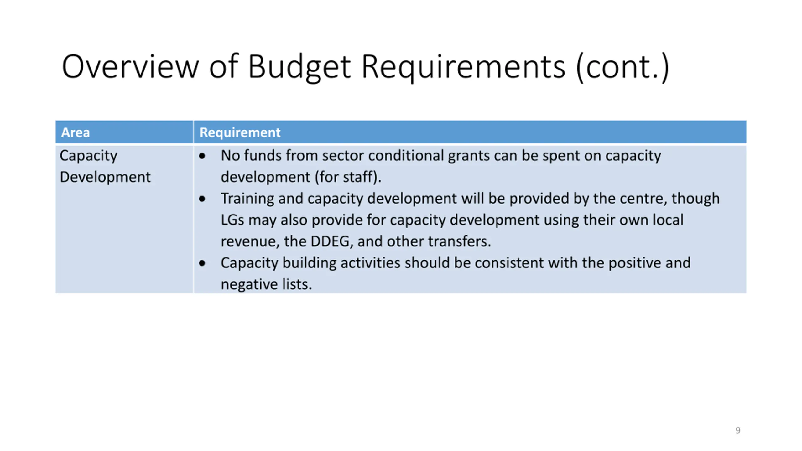 Overview of Budget Requirements (cont.) Area Capacity Development Requirement No funds from sector conditional grants can be spent on capacity development (for staff). Training and capacity development will be provided by the centre, though LGs may also provide for capacity development using their own local revenue, the DDEG, and other transfers. Capacity building activities should be consistent with the positive and negative lists. 9