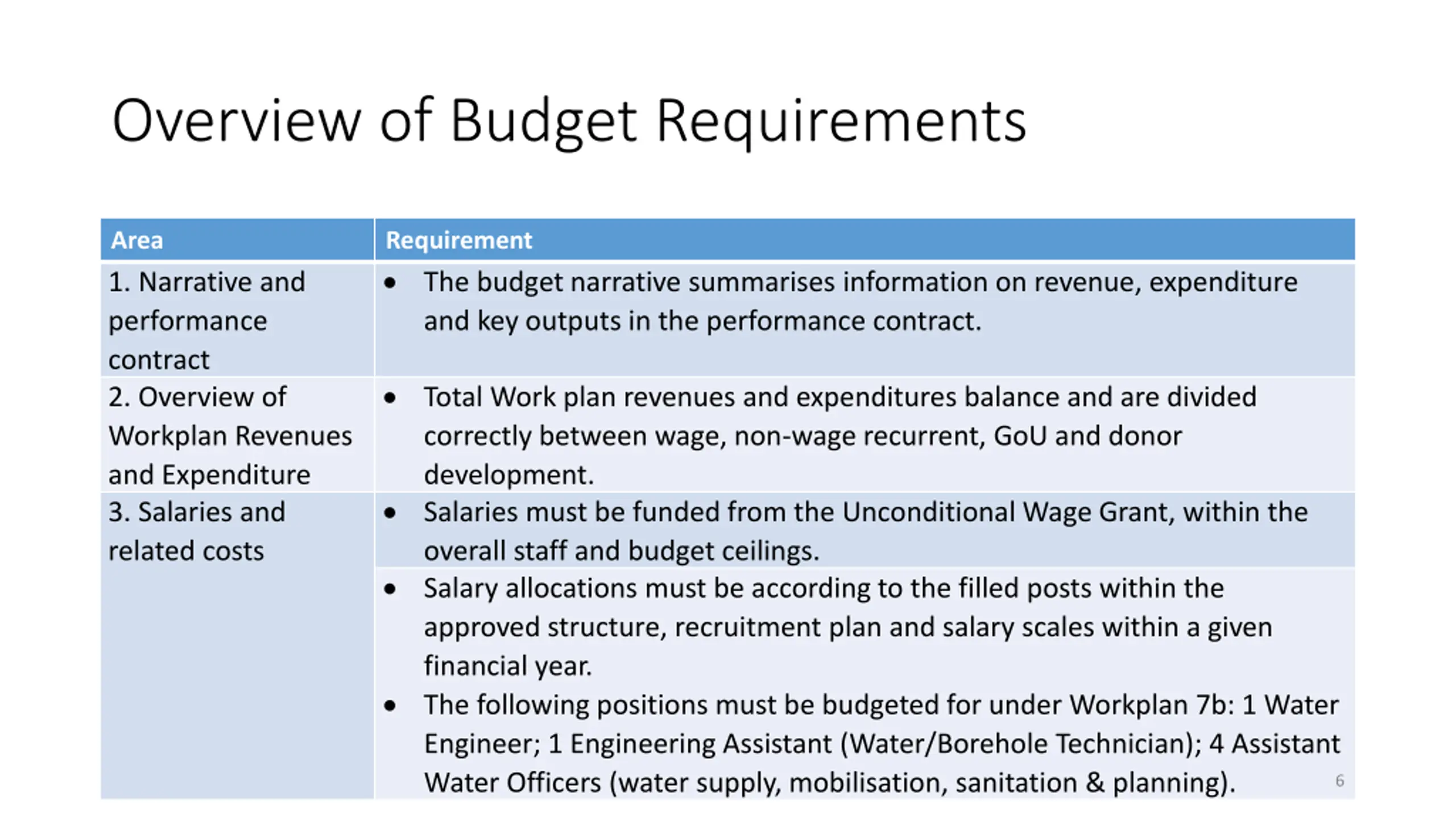 Overview of Budget Requirements Area 1. Narrative and performance contract 2. Overview of Workplan Revenues and Expenditure 3. Salaries and related costs Requirement The budget narrative summarises information on revenue, expenditure and key outputs in the performance contract. Total Work plan revenues and expenditures balance and are divided correctly between wage, non-wage recurrent, GoU and donor development. Salaries must be funded from the Unconditional Wage Grant, within the overall staff and budget ceilings. Salary allocations must be according to the filled posts within the approved structure, recruitment plan and salary scales within a given financial year. The following positions must be budgeted for under Workplan 7b: 1 Water Engineer; 1 Engineering Assistant (Water/Borehole Technician); 4 Assistant Water Officers (water supply, mobilisation, sanitation & planning). 6
