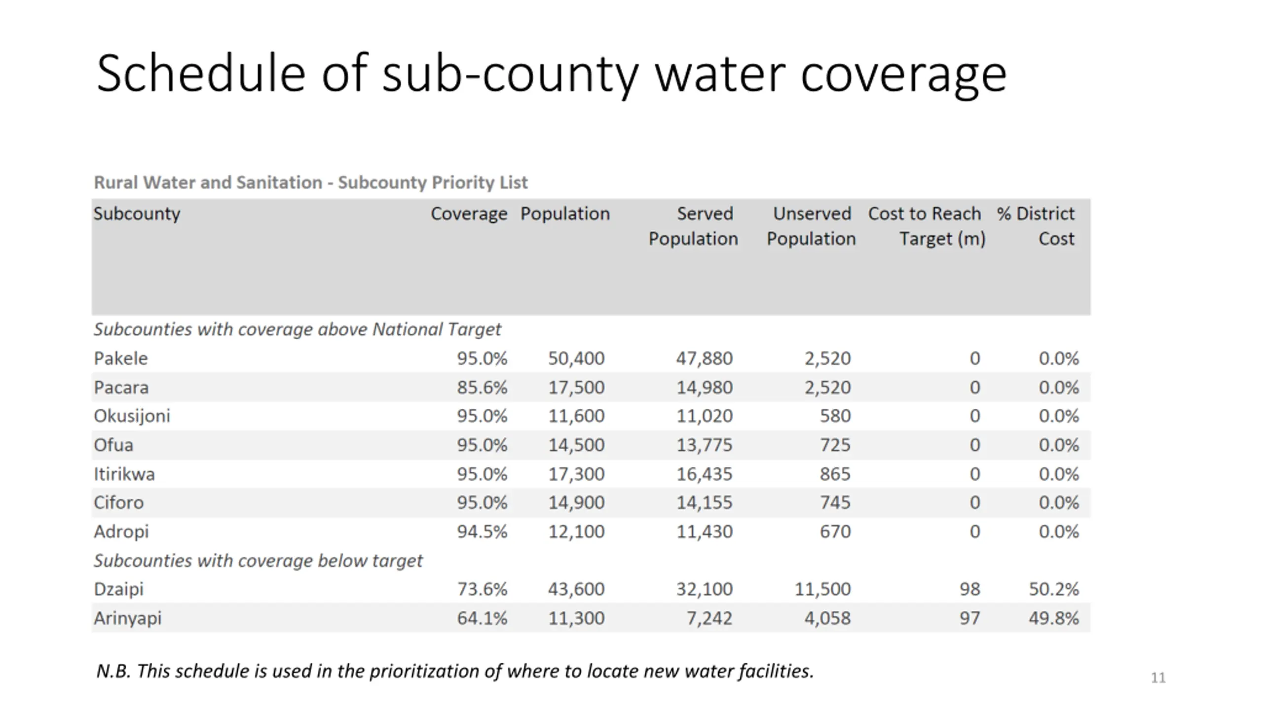 Schedule of sub-county water coverage N.B. This schedule is used in the prioritization of where to locate new water facilities. 11