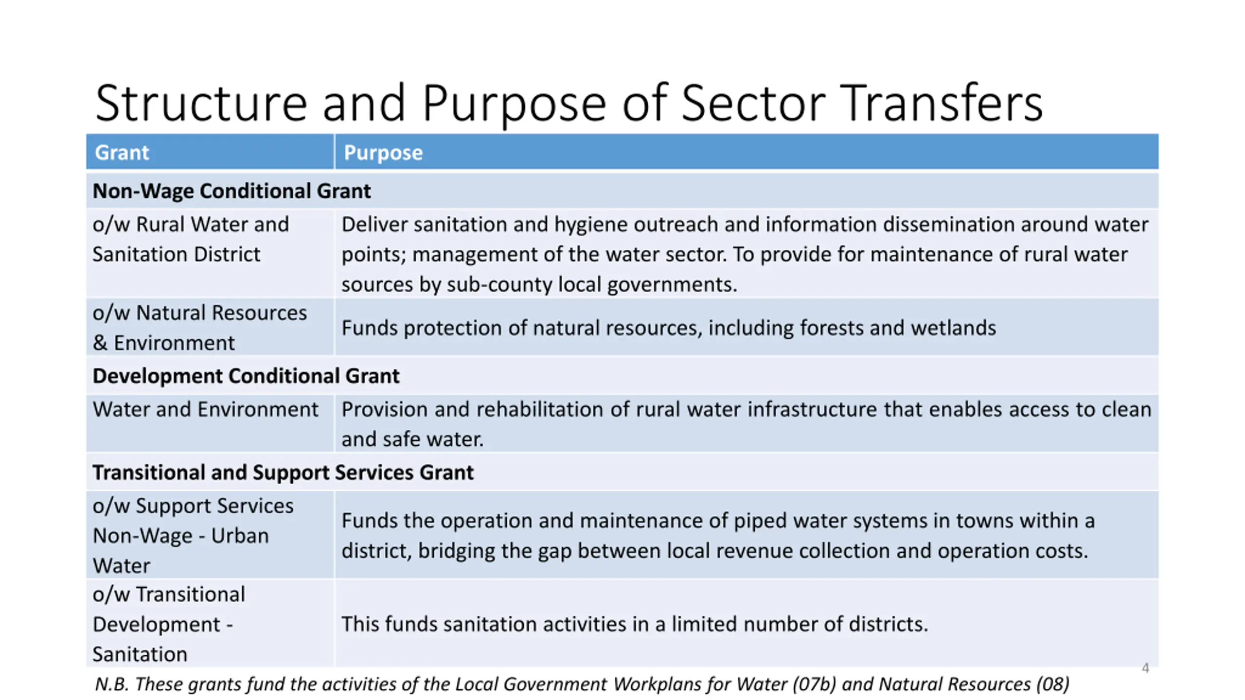 Structure and Purpose of Sector Transfers Grant Purpose Non-Wage Conditional Grant o/w Rural Water and Sanitation District Deliver sanitation and hygiene outreach and information dissemination around water points; management of the water sector. To provide for maintenance of rural water sources by sub-county local governments. o/w Natural Resources & Environment Development Conditional Grant Water and Environment Funds protection of natural resources, including forests and wetlands Provision and rehabilitation of rural water infrastructure that enables access to clean and safe water. Transitional and Support Services Grant o/w Support Services Non-Wage - Urban Water o/w Transitional Development - Sanitation N.B. These grants fund the activities of the Local Government Workplans for Water (07b) and Natural Resources (08) Funds the operation and maintenance of piped water systems in towns within a district, bridging the gap between local revenue collection and operation costs. This funds sanitation activities in a limited number of districts. 4