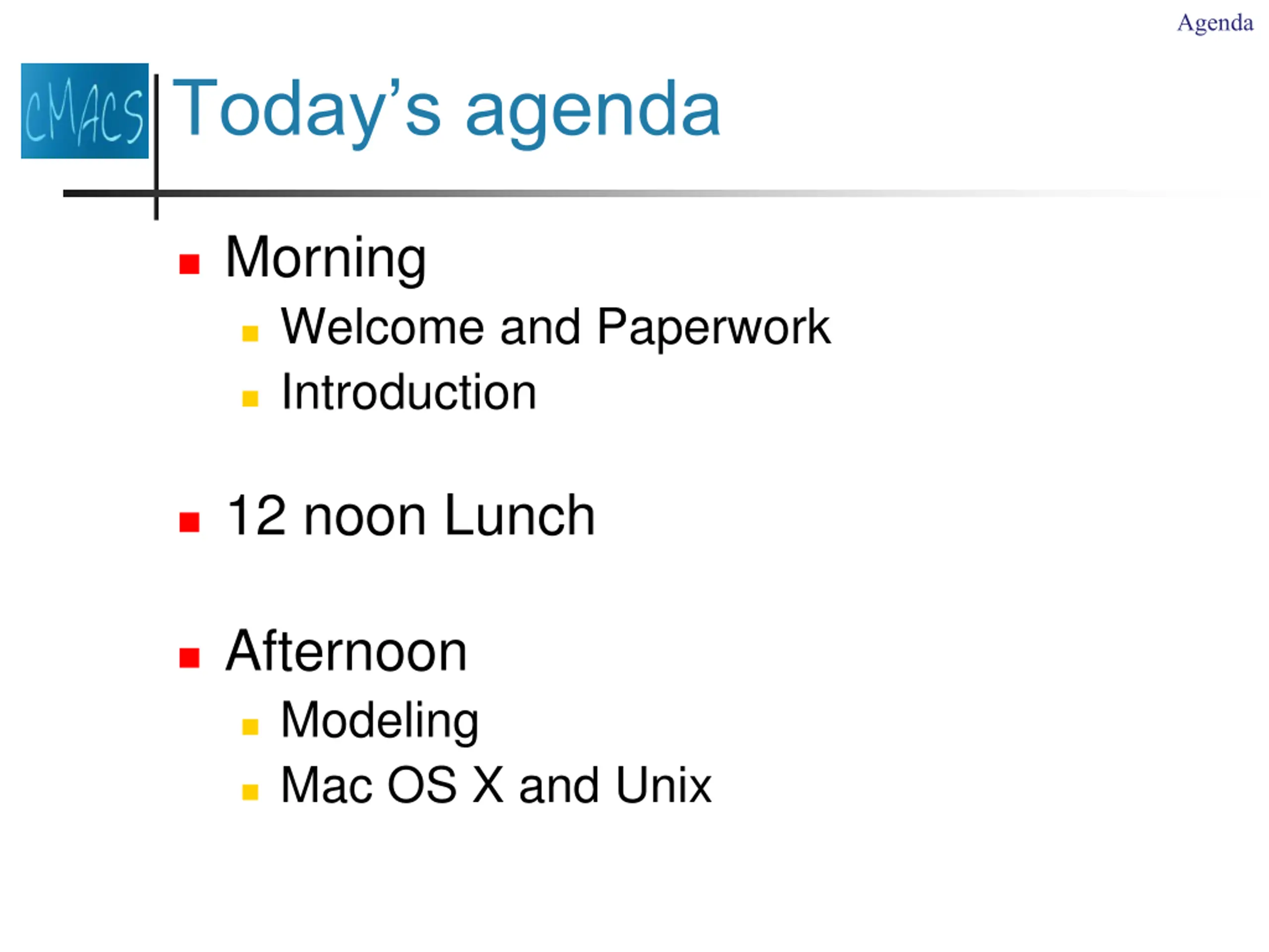 Agenda Today s agenda Morning Welcome and Paperwork Introduction 12 noon Lunch Afternoon Modeling Mac OS X and Unix