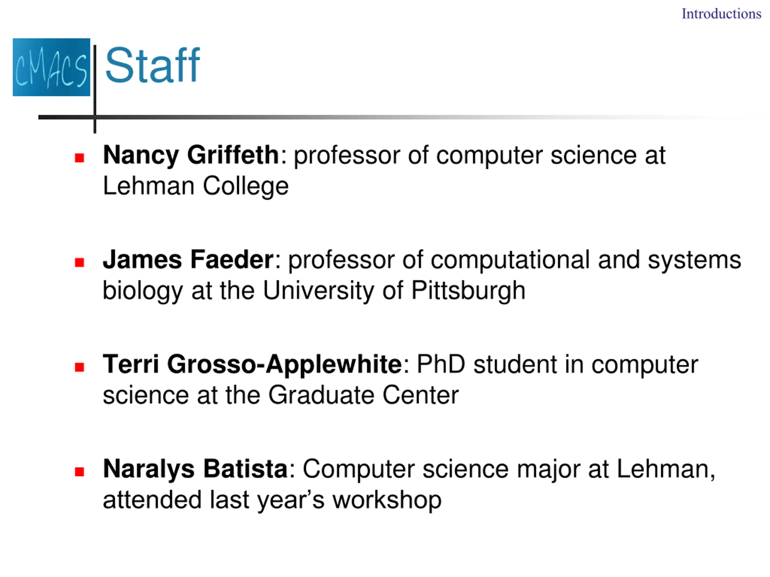 Introductions Staff Nancy Griffeth: professor of computer science at Lehman College James Faeder: professor of computational and systems biology at the University of Pittsburgh Terri Grosso-Applewhite: PhD student in computer science at the Graduate Center Naralys Batista: Computer science major at Lehman, attended last year s workshop