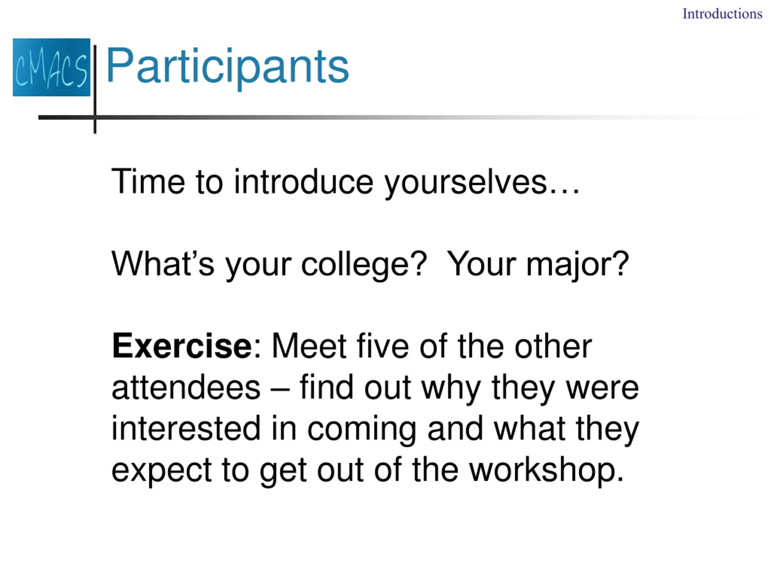 Introductions Participants Time to introduce yourselves What s your college? Your major? Exercise: Meet five of the other attendees find out why they were interested in coming and what they expect to get out of the workshop.