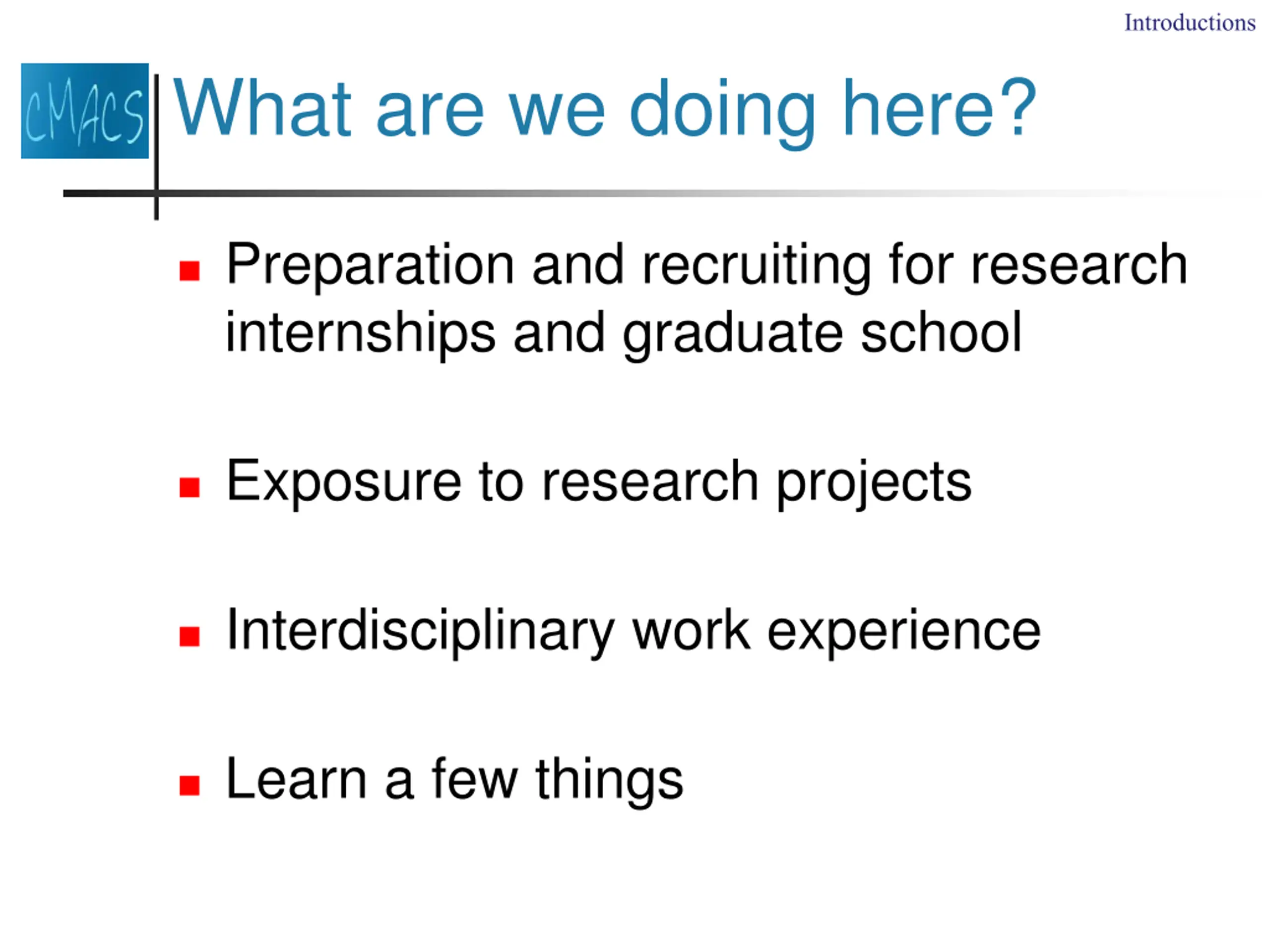 Introductions What are we doing here? Preparation and recruiting for research internships and graduate school Exposure to research projects Interdisciplinary work experience Learn a few things