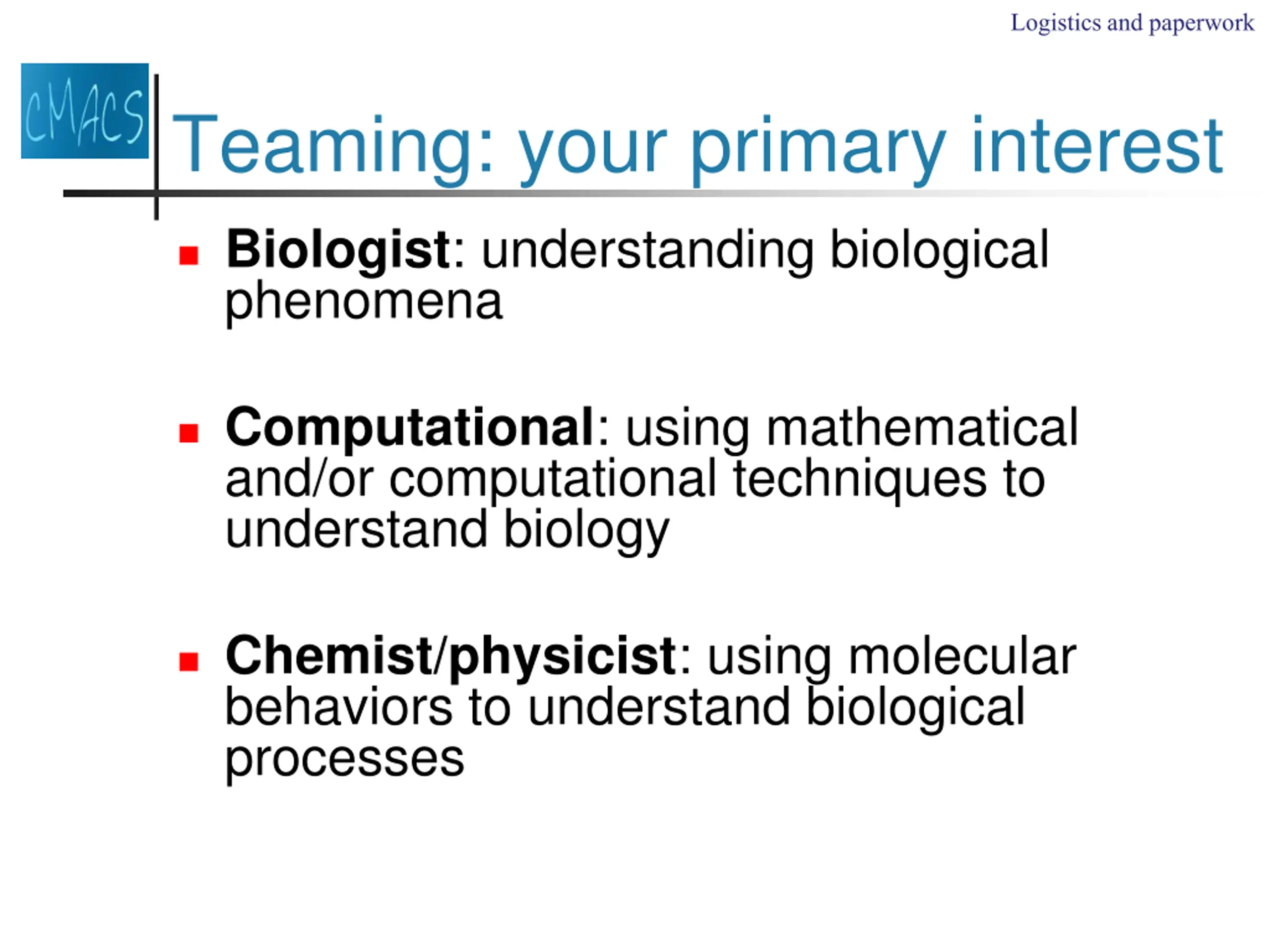 Logistics and paperwork Teaming: your primary interest Biologist: understanding biological phenomena Computational: using mathematical and/or computational techniques to understand biology Chemist/physicist: using molecular behaviors to understand biological processes