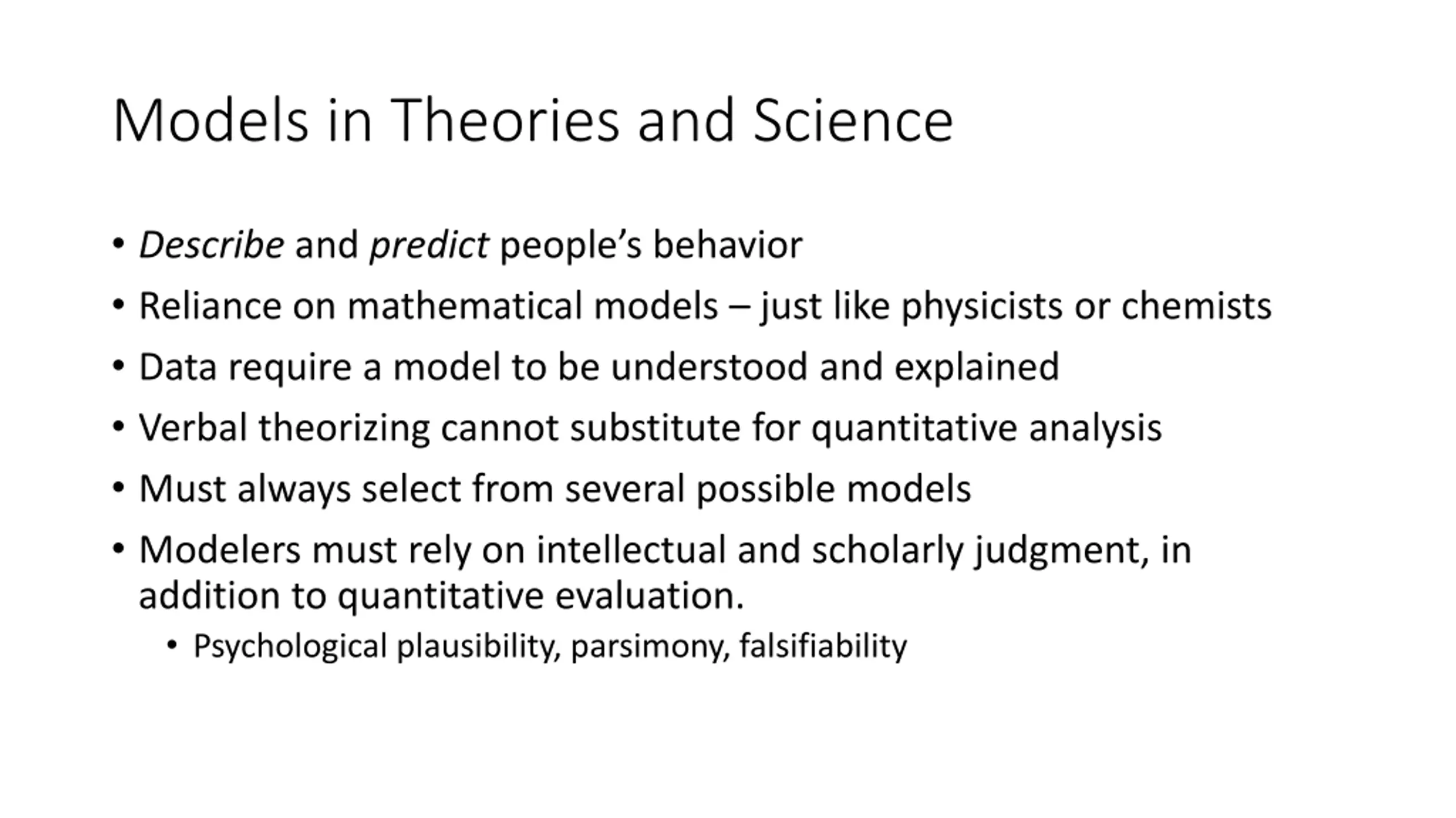 Models in Theories and Science Describe and predict people s behavior Reliance on mathematical models just like physicists or chemists Data require a model to be understood and explained Verbal theorizing cannot substitute for quantitative analysis Must always select from several possible models Modelers must rely on intellectual and scholarly judgment, in addition to quantitative evaluation. Psychological plausibility, parsimony, falsifiability