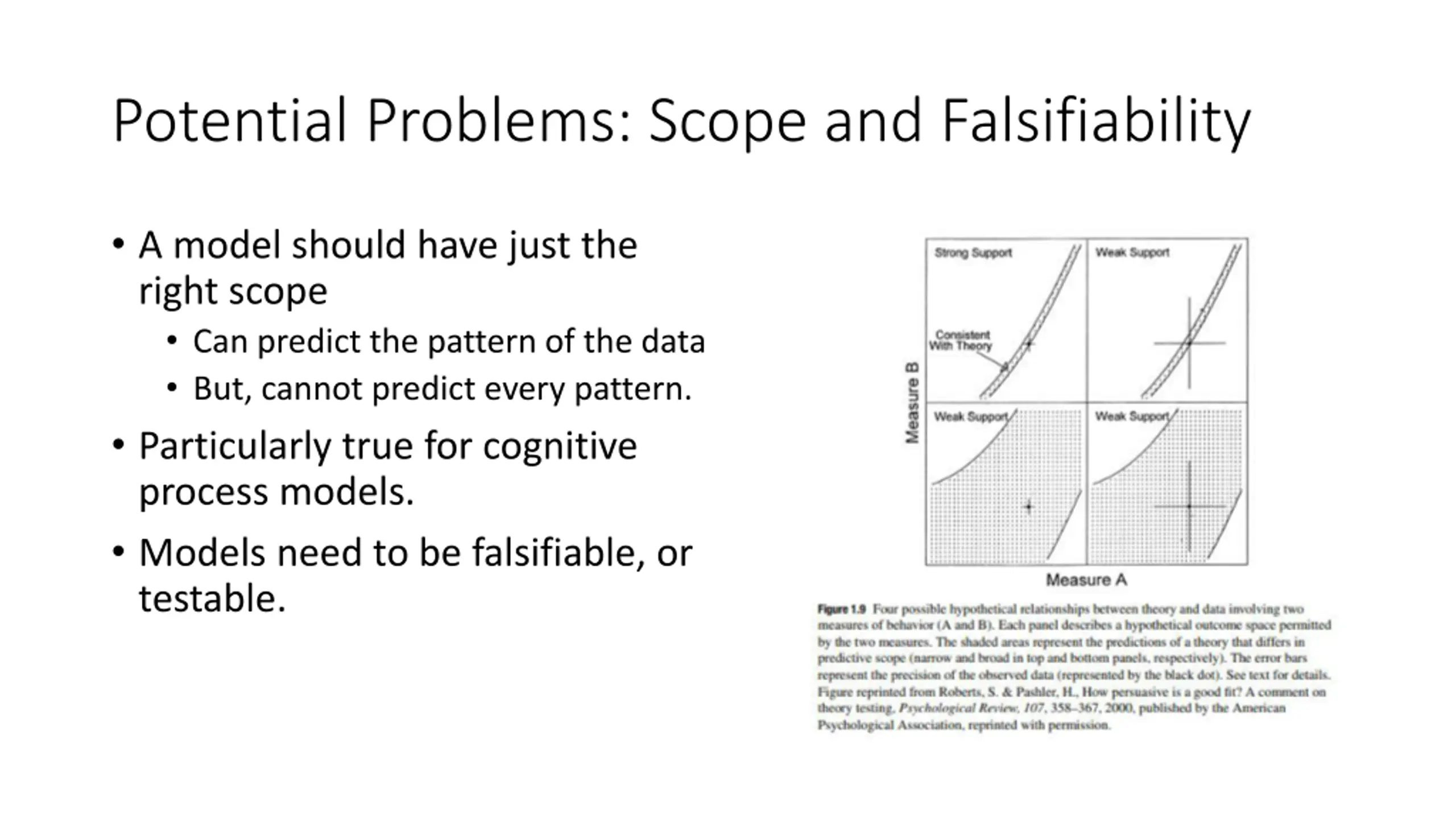 Potential Problems: Scope and Falsifiability A model should have just the right scope Can predict the pattern of the data But, cannot predict every pattern. Particularly true for cognitive process models. Models need to be falsifiable, or testable.