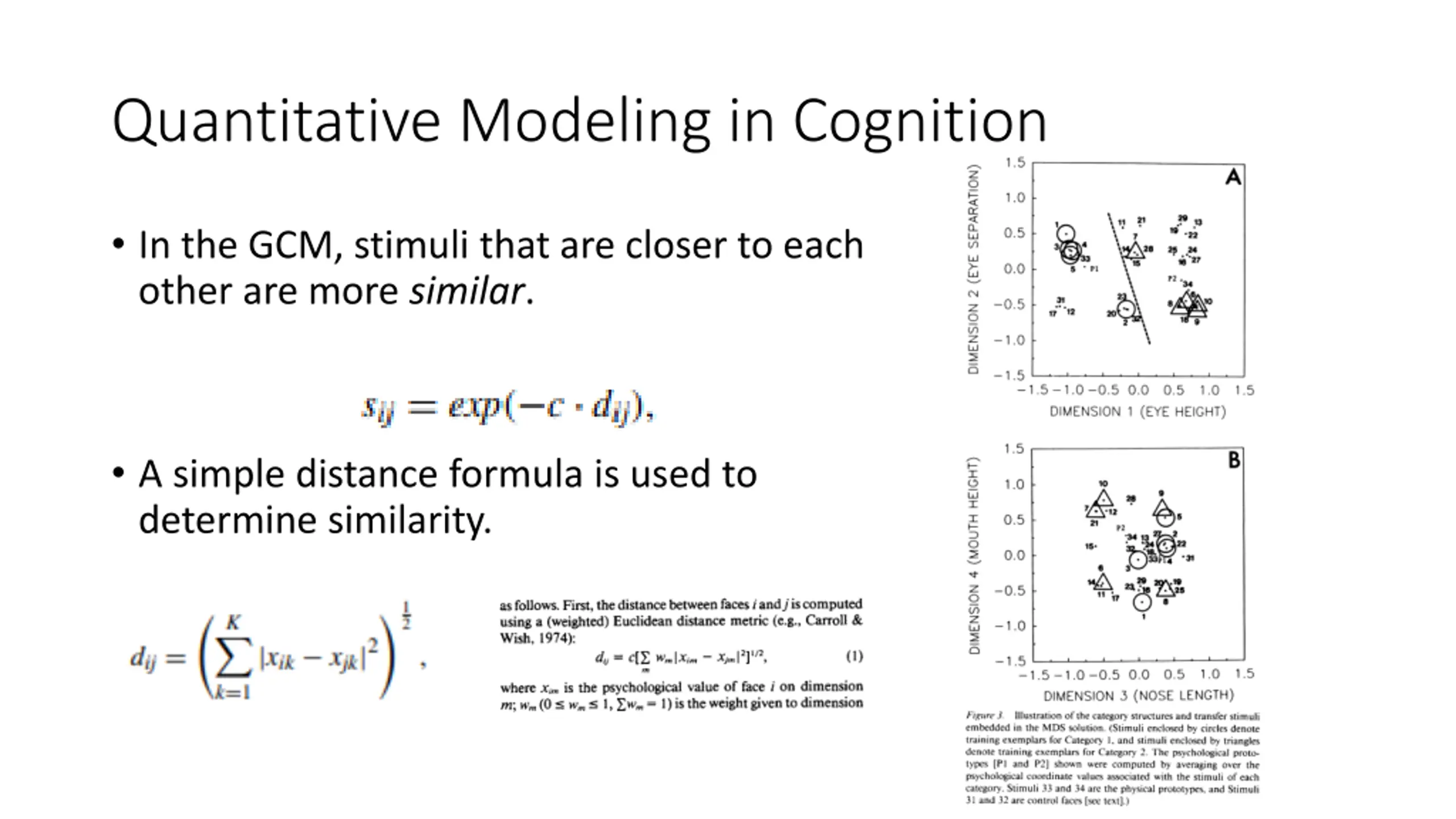 Quantitative Modeling in Cognition In the GCM, stimuli that are closer to each other are more similar. A simple distance formula is used to determine similarity.