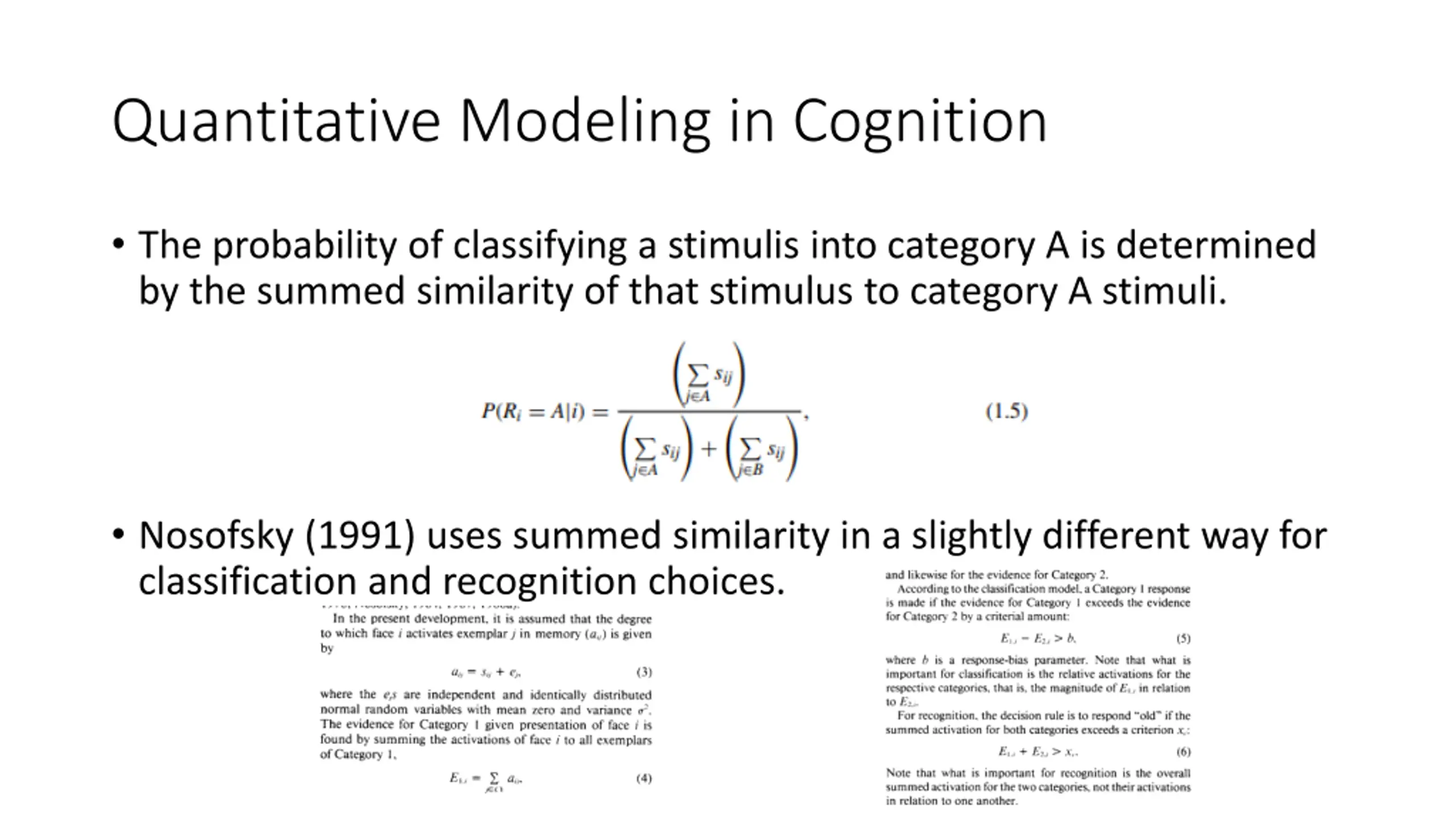 Quantitative Modeling in Cognition The probability of classifying a stimulis into category A is determined by the summed similarity of that stimulus to category A stimuli. Nosofsky (1991) uses summed similarity in a slightly different way for classification and recognition choices.