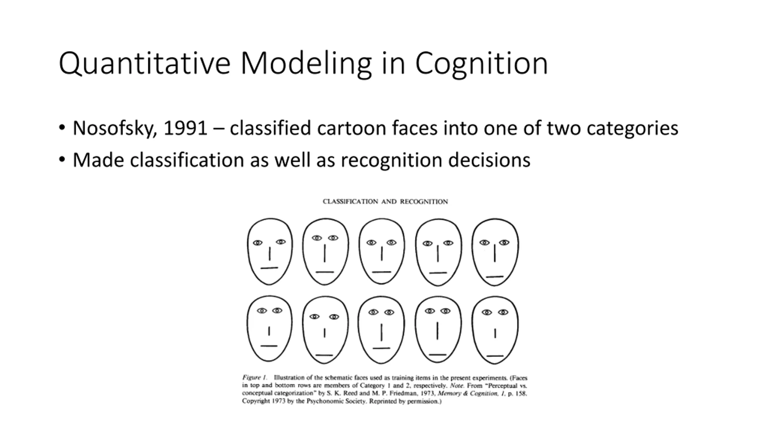 Quantitative Modeling in Cognition Nosofsky, 1991 classified cartoon faces into one of two categories Made classification as well as recognition decisions