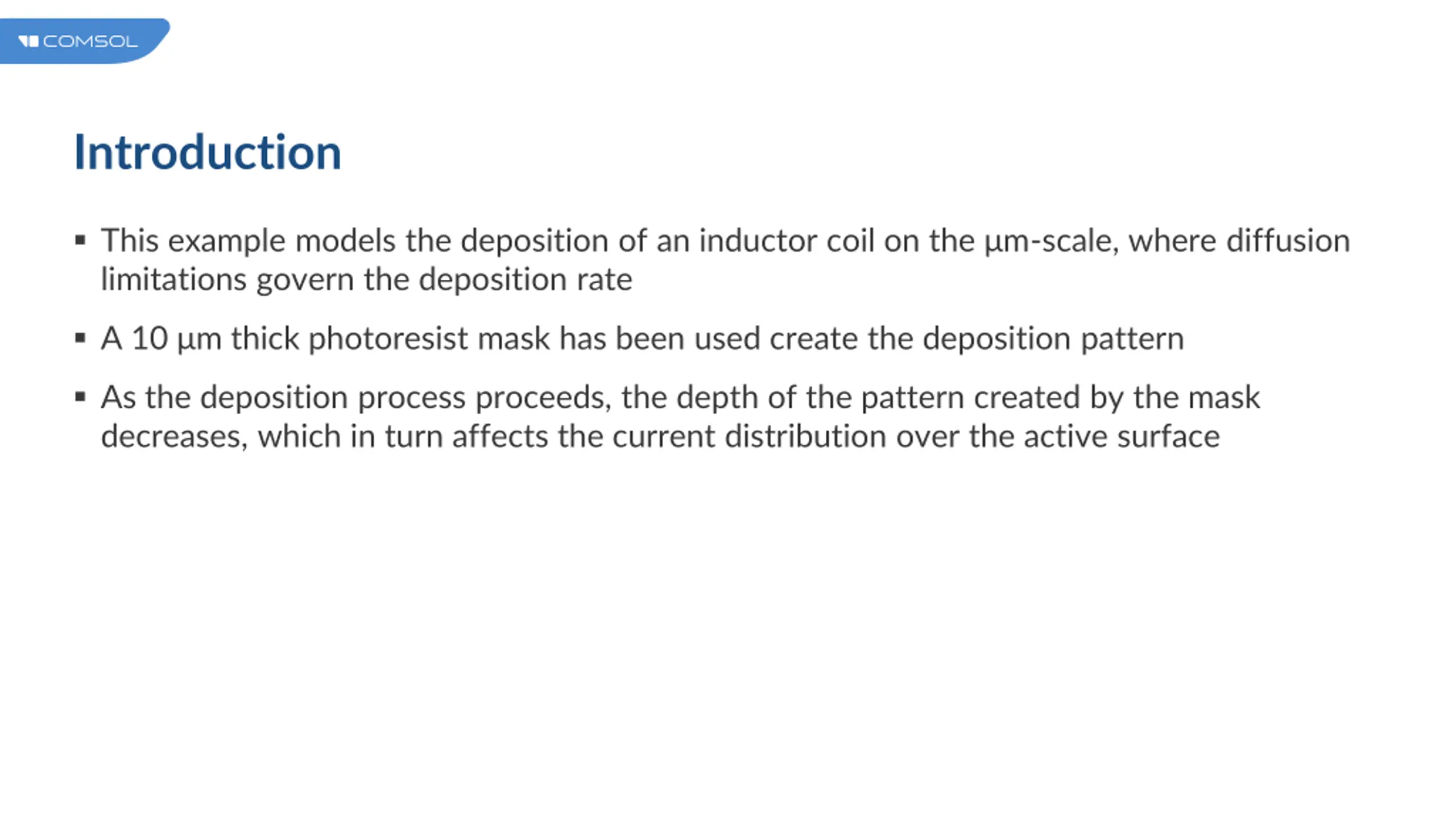 Introduction This example models the deposition of an inductor coil on the m-scale, where diffusion limitations govern the deposition rate A 10 m thick photoresist mask has been used create the deposition pattern As the deposition process proceeds, the depth of the pattern created by the mask decreases, which in turn affects the current distribution over the active surface