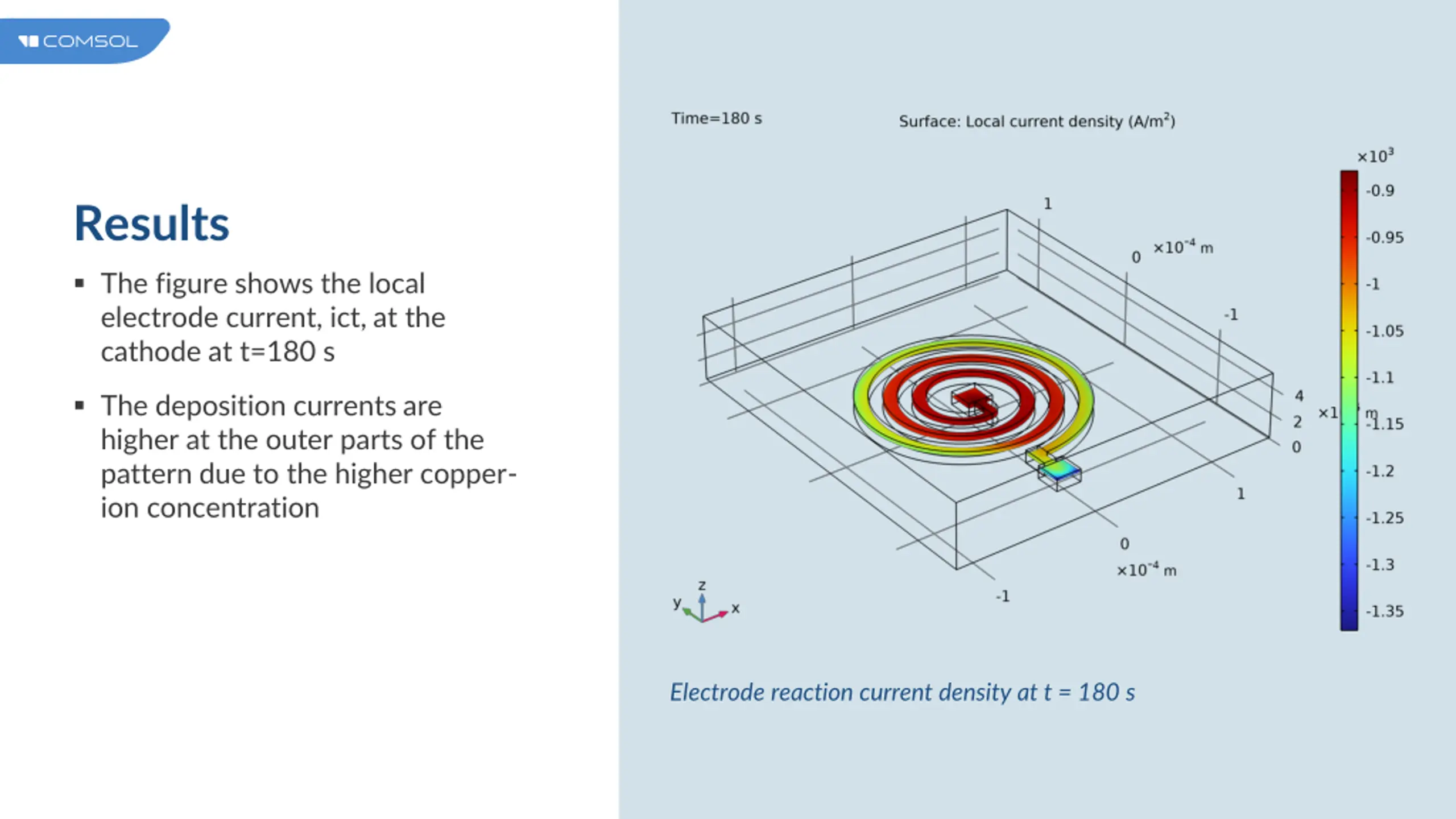 Results The figure shows the local electrode current, ict, at the cathode at t=180 s The deposition currents are higher at the outer parts of the pattern due to the higher copper- ion concentration Electrode reaction current density at t = 180 s