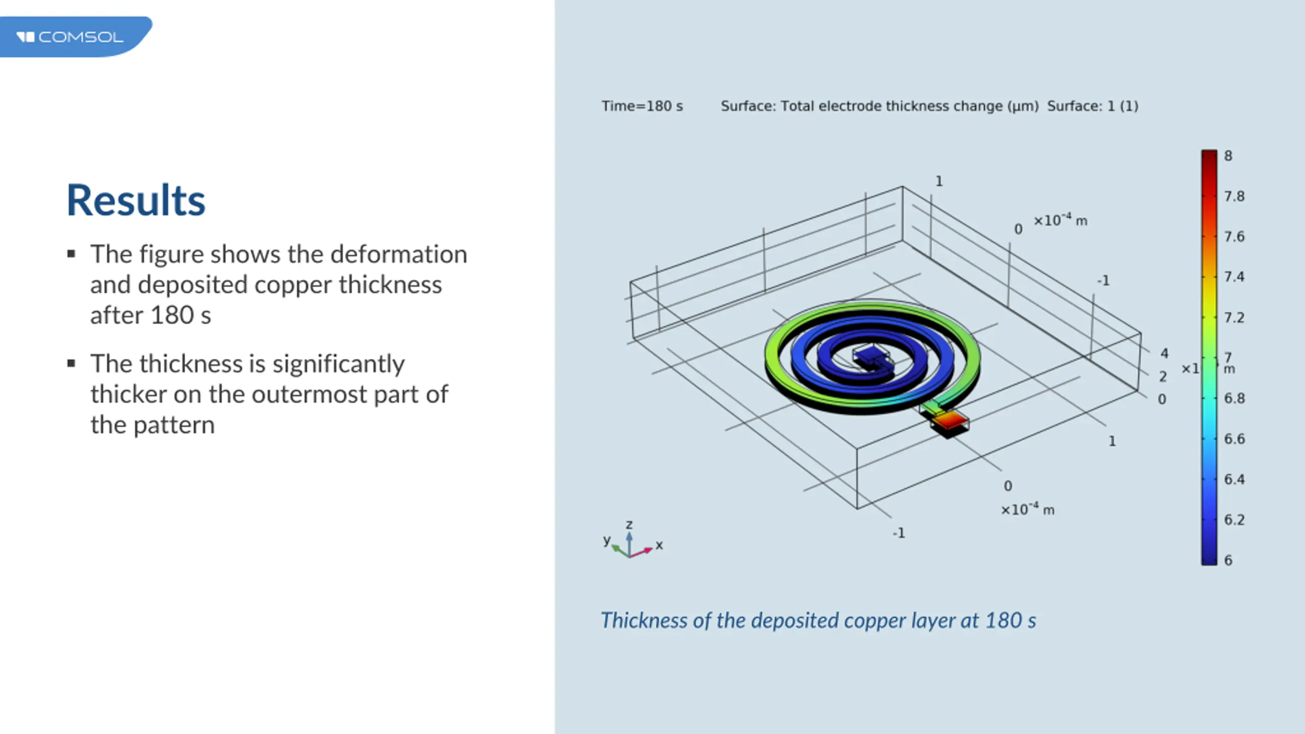 Results The figure shows the deformation and deposited copper thickness after 180 s The thickness is significantly thicker on the outermost part of the pattern Thickness of the deposited copper layer at 180 s