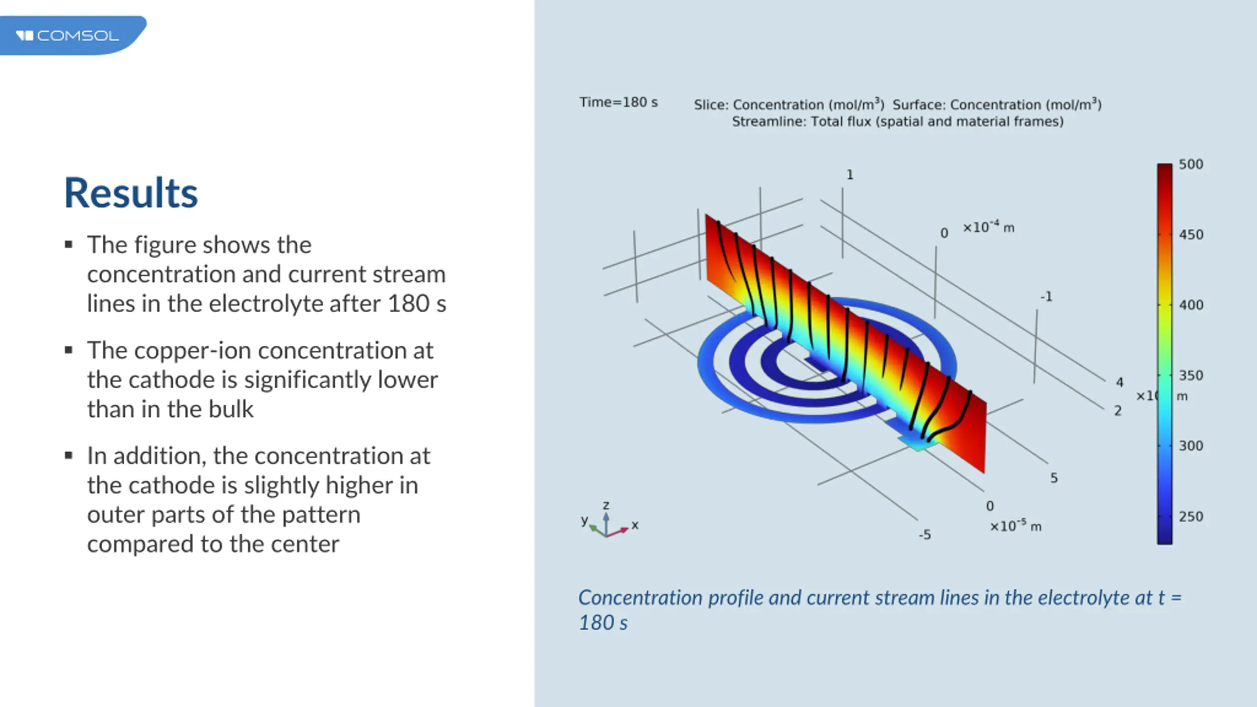 Results The figure shows the concentration and current stream lines in the electrolyte after 180 s The copper-ion concentration at the cathode is significantly lower than in the bulk In addition, the concentration at the cathode is slightly higher in outer parts of the pattern compared to the center Concentration profile and current stream lines in the electrolyte at t = 180 s