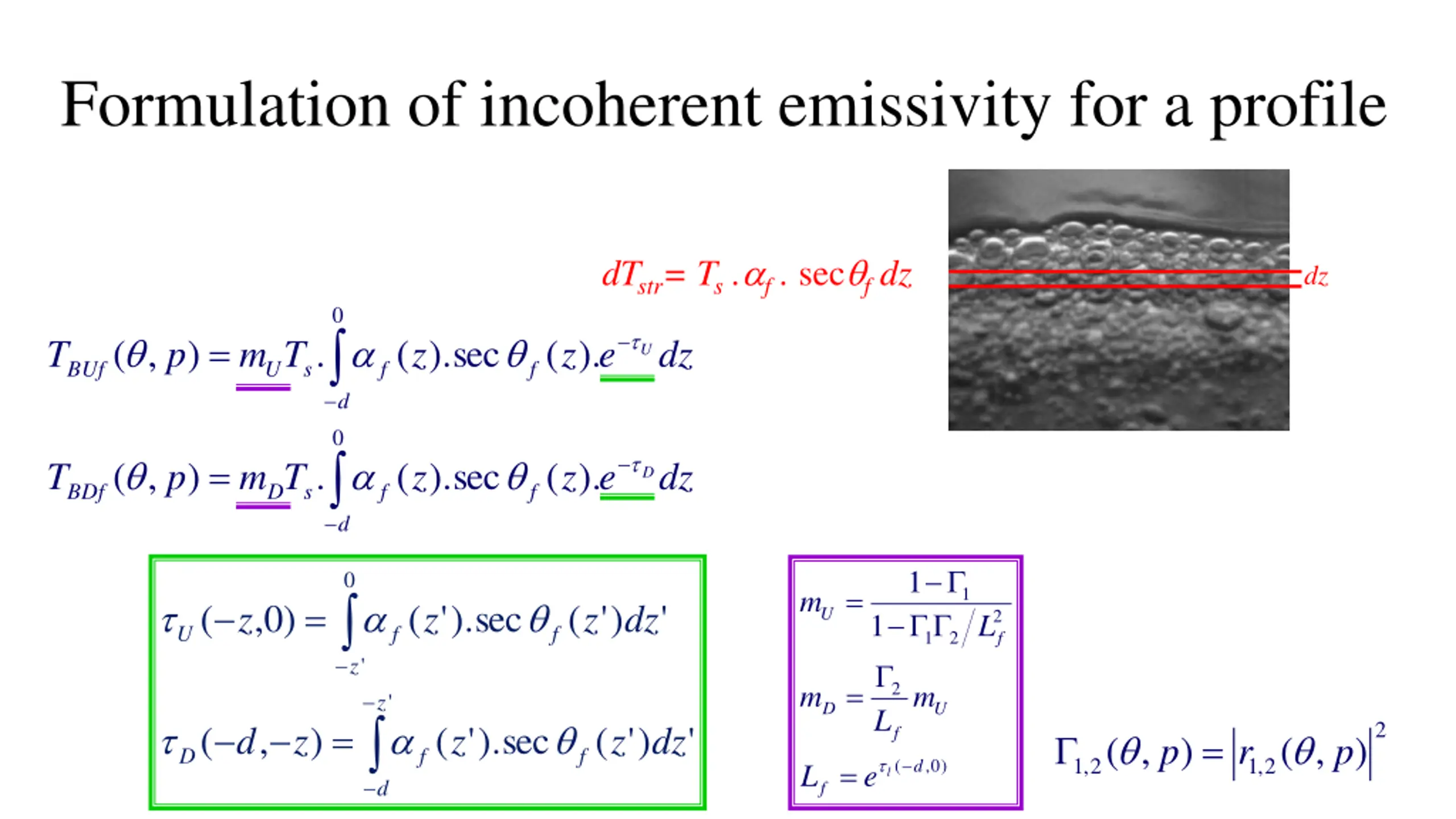 Formulation of incoherent emissivity for a profile dTstr= Ts . f . sec f dz dz 0 ( = , ) . ( ). sec ( ). T p m T z z e dz U BUf U s f f d 0 ( = , ) . ( ). sec ( ). T p m T z z e dz D BDf D s f f d 1 0 = 1 m = ( ) 0 , z ( ). ' z sec ( ) ' z ' dz U 2 f 1 L U f f 1 2 ' z = 2 m m ' z D U L = 2 ( , ) ( ). ' z sec ( ) ' z ' d z dz f 2 , 1 = ( , ) ( , ) p 2 , 1 r p D f f = ( ) 0 , d L e l d f