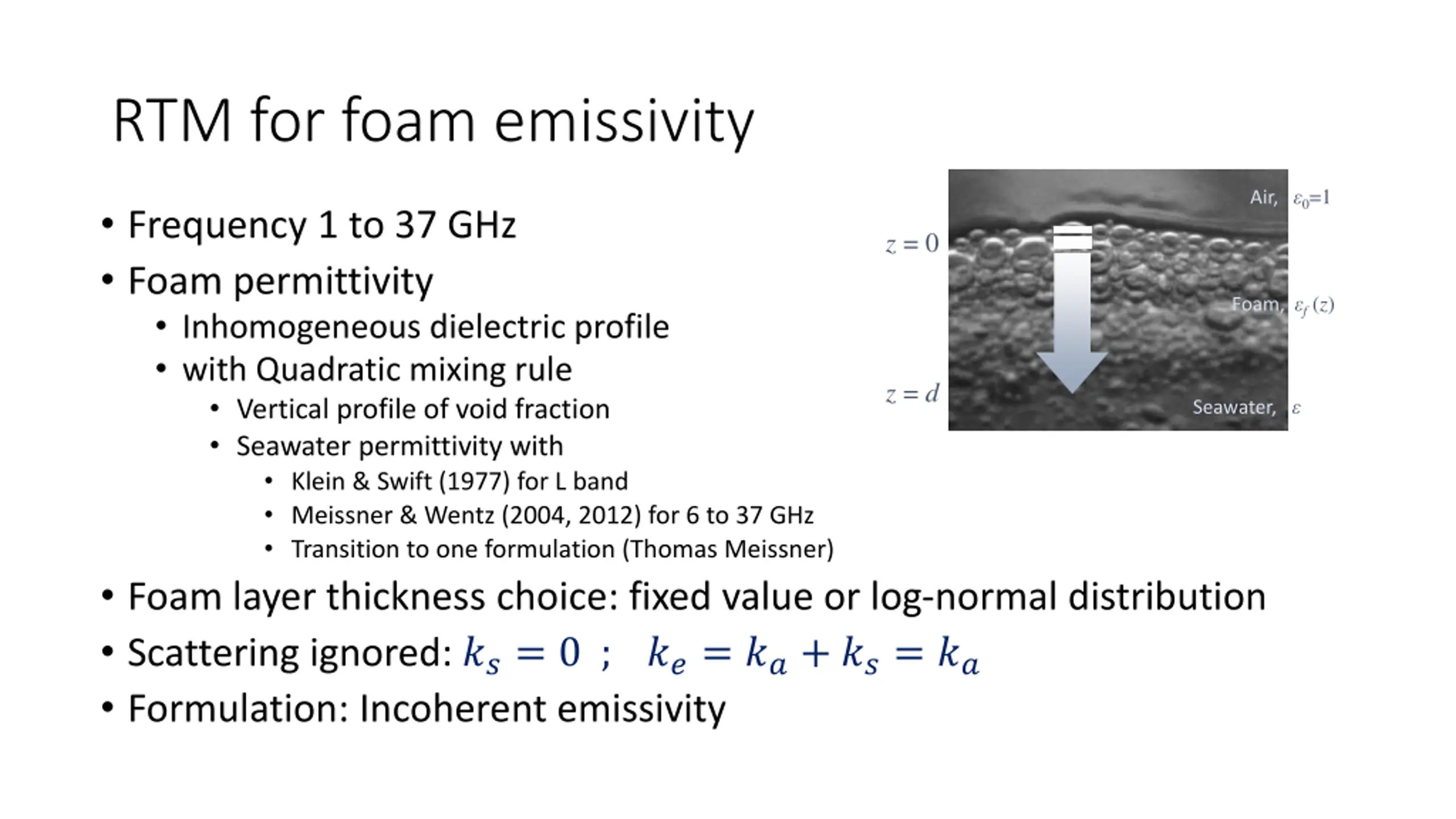 RTM for foam emissivity Air, , 0=1 Frequency 1 to 37 GHz Foam permittivity Inhomogeneous dielectric profile with Quadratic mixing rule Vertical profile of void fraction Seawater permittivity with Klein & Swift (1977) for L band Meissner & Wentz (2004, 2012) for 6 to 37 GHz Transition to one formulation (Thomas Meissner) Foam layer thickness choice: fixed value or log-normal distribution Scattering ignored: ??= 0 ; ??= ??+ ??= ?? Formulation: Incoherent emissivity z = 0 Foam, f (z) z = d Seawater, ,