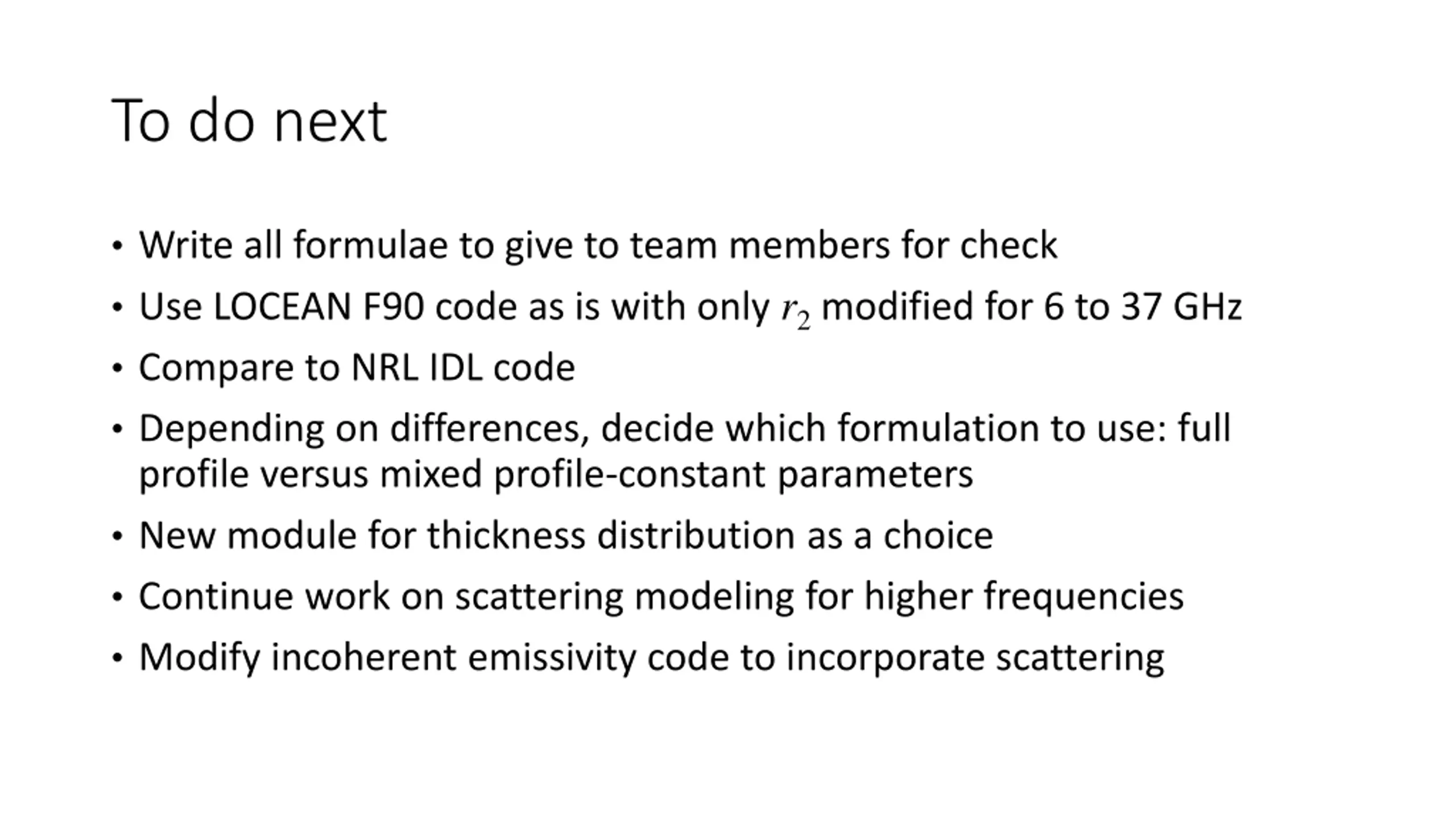 To do next Write all formulae to give to team members for check Use LOCEAN F90 code as is with only r2 modified for 6 to 37 GHz Compare to NRL IDL code Depending on differences, decide which formulation to use: full profile versus mixed profile-constant parameters New module for thickness distribution as a choice Continue work on scattering modeling for higher frequencies Modify incoherent emissivity code to incorporate scattering