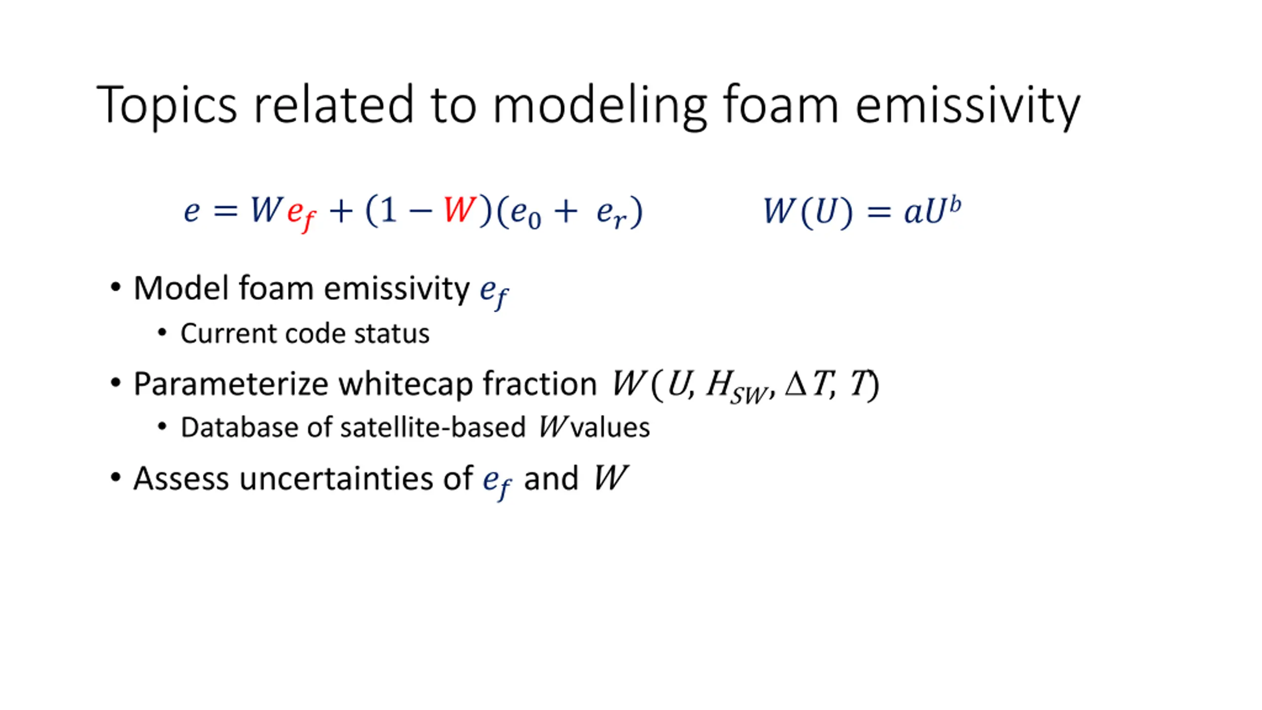 Topics related to modeling foam emissivity ?(?) = ??? ? = ???+ 1 ? (?0+ ??) Model foam emissivity ?? Current code status Parameterize whitecap fraction W (U, HSW , T, T) Database of satellite-based W values Assess uncertainties of ?? and W