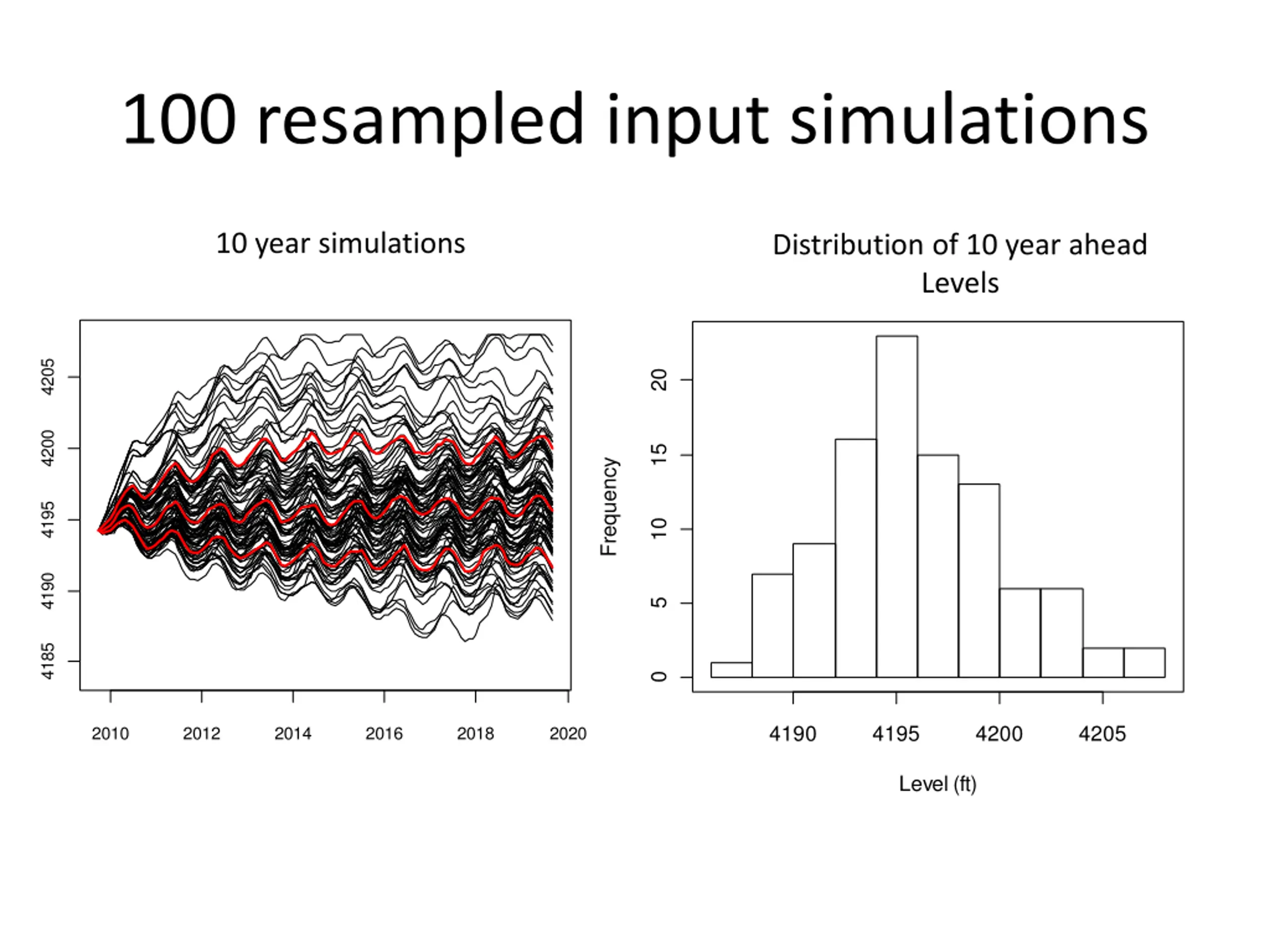 100 resampled input simulations 10 year simulations Distribution of 10 year ahead Levels 4205 20 4200 15 Frequency 4195 10 4190 5 4185 0 4190 4195 4200 4205 2010 2012 2014 2016 2018 2020 Level (ft)