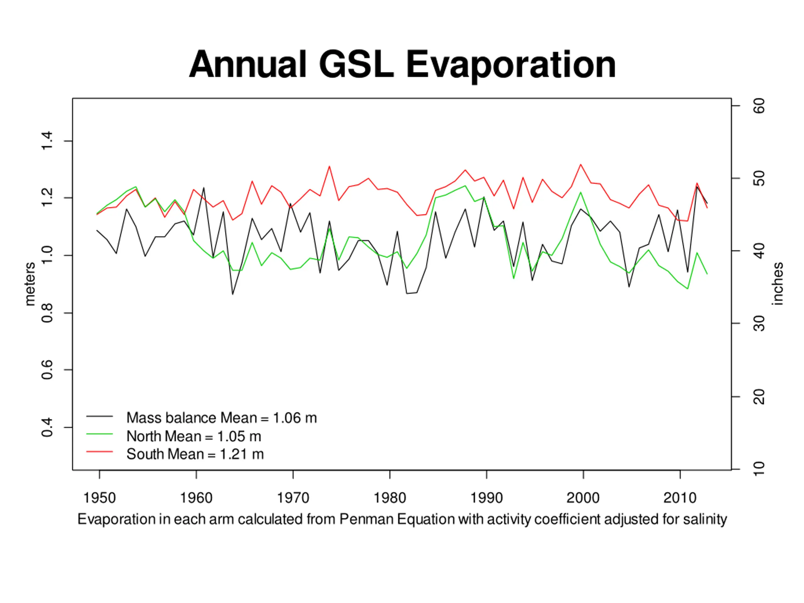 Annual GSL Evaporation 60 1.4 50 1.2 40 1.0 meters inches 0.8 30 0.6 20 Mass balance Mean = 1.06 m North Mean = 1.05 m South Mean = 1.21 m 0.4 10 1950 Evaporation in each arm calculated from Penman Equation with activity coefficient adjusted for salinity 1960 1970 1980 1990 2000 2010